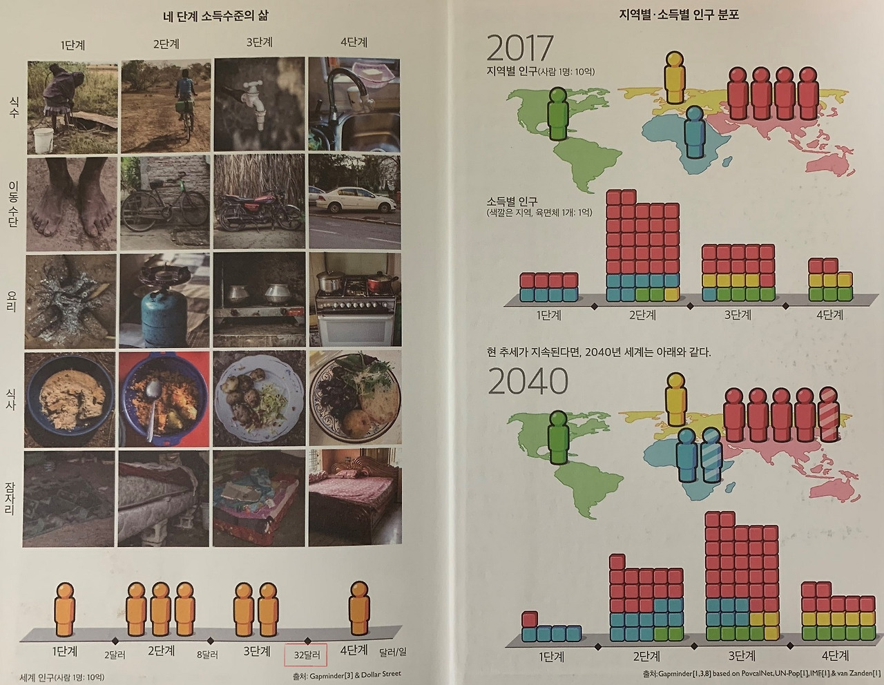 약 60억이다. 10억을 제외한 인구가 그 이하의 금액으로 산다. 평생 해외여행 한번 가지 못하는 액수다. 정보를 제대로 찾아보기 전에는, 내가 기존에 경험해왔던 다양한 국가의 사람들의 이야기는 그냥 예외 중에 하나라고 생각했다. 그러나 아니다. 나는 어렸을 때-조금 위험한 생각일 수도 있지만-어린 마음에, 테러가 일어나고 문제가 생기는 대다수는 경제 하위층의 분노로 생겨나는 것이라고 생각했다. 그래서 그들이 없다면 세계가 더 행복해지지 않을까 하고 생각했다. 그 수는 내 개인적인 기준하에 대략 10억 명 정도 될 거라고 생각했다. 그런데 실제로 대략 내 기준에 해당하는 사람들은 10억이 아닌 60억이었던 것이다. 나의 예상과 실제 현실은 현저하게 달랐다.