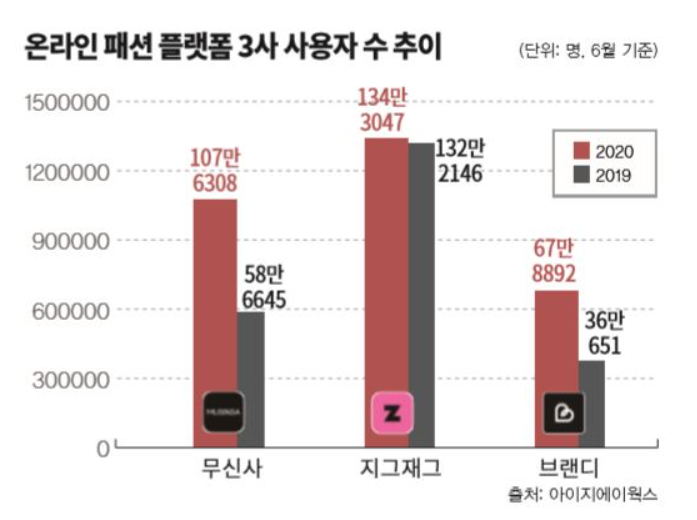 2020년 6월, 패션 모바일 앱 데이터를 분석한 결과 브랜드의 사용자 수(MAU)는 약 67만에 이르렀다.전년 대비 각각 84% 증가한 수치다.