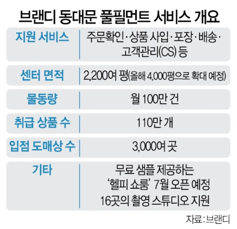 쇼핑몰 창업에 필요한 사입, 배송, CS, 유통, 판매 등을 제공해주는 풀필먼트를 지원하고 셀러에게 매출의 10%를 제공하는 서비스이다. 동대문 판매자의 모든 주문 후 업무를 원스톱으로 처리해주는 서비스로서, 기본적인 물류대행 서비스(3PL+CS)와 함께 사입자금지원, 마케팅지원, 컨설팅을 포함한 브랜디만의 판매자 지원 프로그램인 것이다. 상품을 판매자가 개별적으로 사입하는 것이 아니기 때문에 재고 부담도 없다.