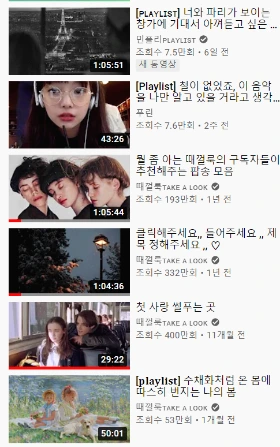 사실 다양한 음악 플레이리스트 채널이 있지만, 제가 때껄룩을 구독하는 가장 큰 이유는 '적절함'입니다. 드라이브할 때, 더위 식힐 때, 짝사랑에 지쳤을 때 등 어떤 상황에 대해 팝(POP)이나 K-POP 노래 선곡을 기가막히게 해서 그 상황 속을 공감해주고 위로해주는 느낌을 줍니다. 또한, 하이틴 노래, 도입부 지리는 노래, 주식할 때 들으면 수익 1000퍼 보장 등 뭘 들어야 할지 모를 때 유쾌한 제목으로 트리거하는 능력도 있습니다.