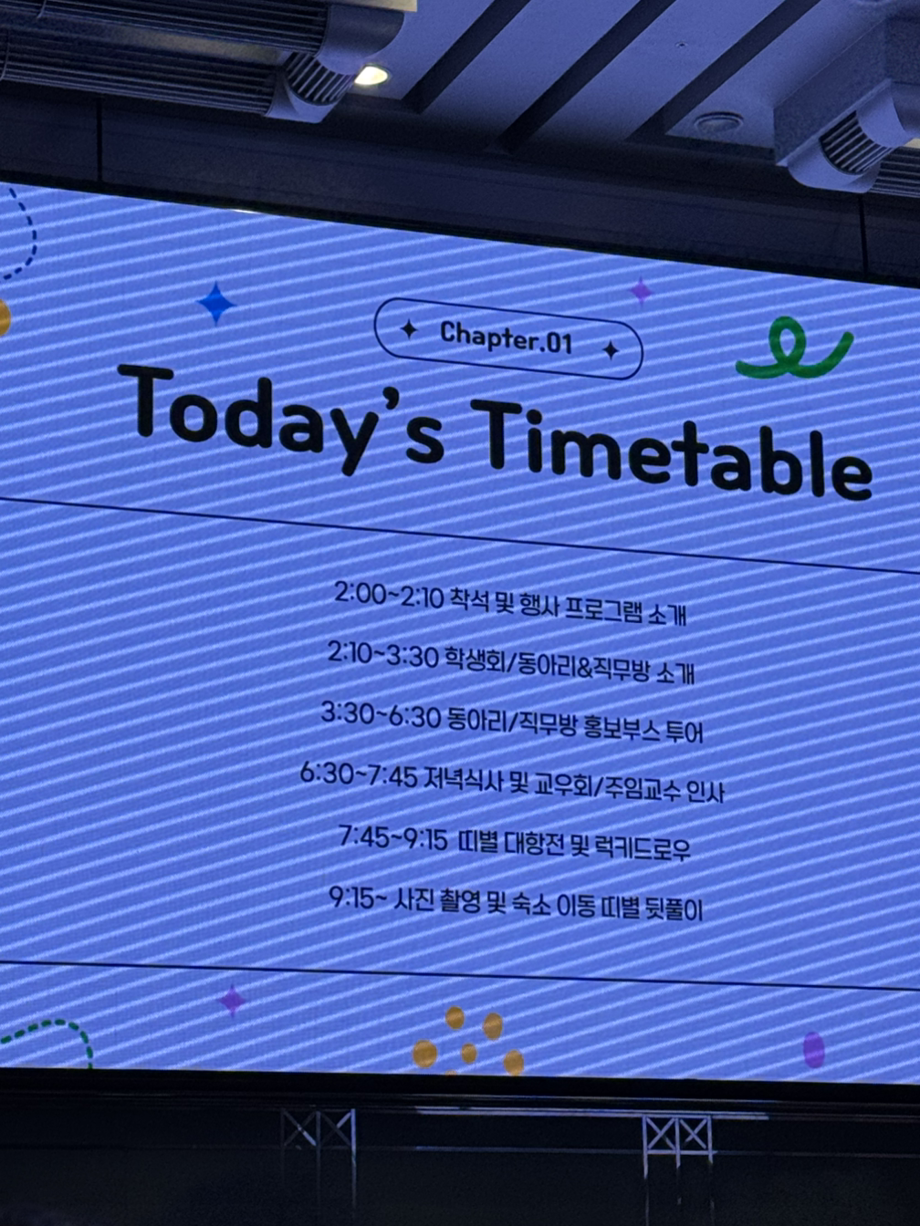 학생회/교우회 인사, 학교생활의 꿀팁, 2025년 전체 학교행사 등 전체적인 얘기와 함께 각각의 동아리 및 직무방 회장님들께서 무대 위로 올라오셔서 어필을 합니다.