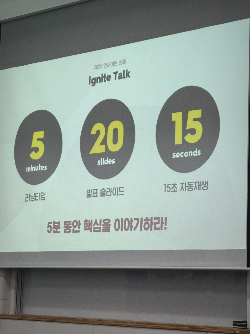 - 강연자는 5분 내로 발표해야함 (PPT 슬라이드는 15초마다 자동재생됨)