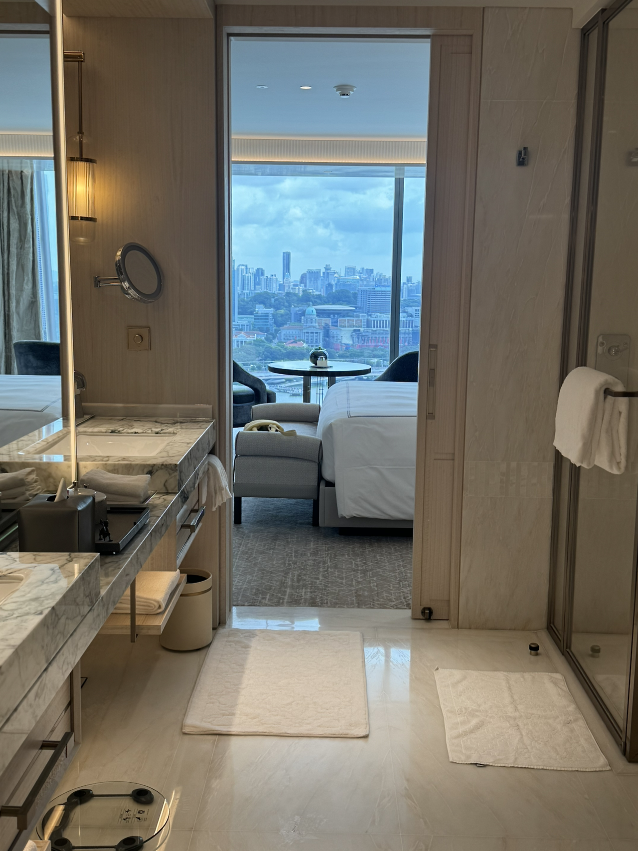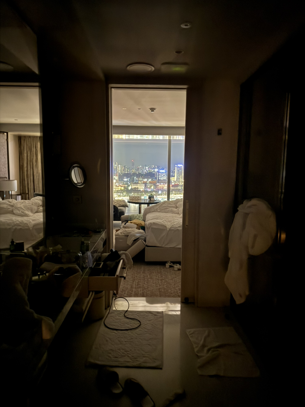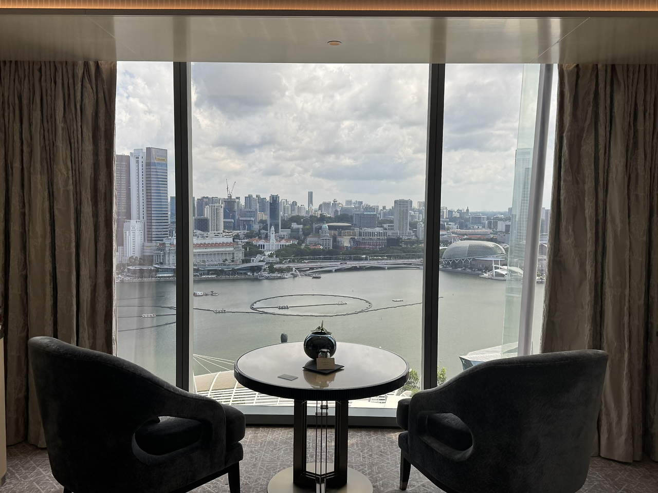 12:30 pm 마리나베이샌즈에 조금 이르게 도착했다. 운이 좋게 얼리 체크인도 되었고 평일 화요일이다보니 방도 업그레이드를 해주었다. 마리나베이샌즈 호텔에 가면 택시에서 문을 열어주면서 짐을 옮겨준다. 어마어마한 호텔에서 주는 서비스는 '투숙객이 숨 쉬는 것을 제외하고 어떤 것도 힘이 들지 않게 하는구나' 싶더라. 그렇게 체크인하고 받는 카드키로 26층으로 올라갔다.