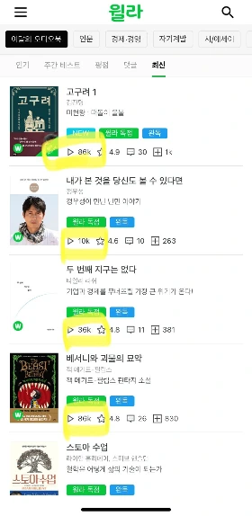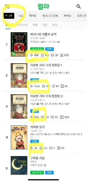 윌라 시그니처 오디오북인 김진명 작가의 '고구려', 배우 정우성 목소리가 들리는 '내가 본 것을 당신도 볼 수 있다면' 등은 유명 저자와 유명 배우라는 인지도를 가지고 있다. 각각 고구려는 86k(8만 6천), 내가 본 것을 당신도 볼수 있다면은 10k(1만) 정도의 조회수를 말한다. 이보다 더 많은 조회수는 주니어 도서에서 찾아볼 수 있다. 이상한 과자 가게 천전당 102k(10만 2천), '베서니와 괴물의 요약'은 85k(8만 5천)으로 일반 베스트 셀러 오디오북과 비슷하거나 그 이상의 조회수를 보이고 있다. 이를 통해, 주니어 도서 즉, 아동 도서를 듣는 연령대와 그들을 관리하는 학부모의 이용 비중이 높다는 것을 알 수 있다.