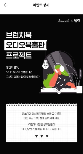 윌라는 글쓰기와 오디오북 역시 결합가능할 수 있음을 보여주면서 브런치와의 이벤트를 진행하고 있다. 브런치는 작가가 자신들의 글을 쓰는 플랫폼으로, 브런치북은 브런치 작가가 쓴 글을 책으로 기획하는 제작하는 오리지널 초판을 말한다. 이번 프로젝트를 통해 ‘브런치북’을 유명 성우의 오디오북으로 재탄생시키는 캠페인으로 다양한 장르의 책이 오디오북이 될 수 있음을 보여주고 있다.
