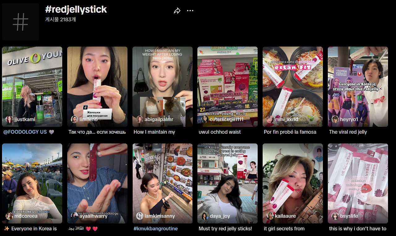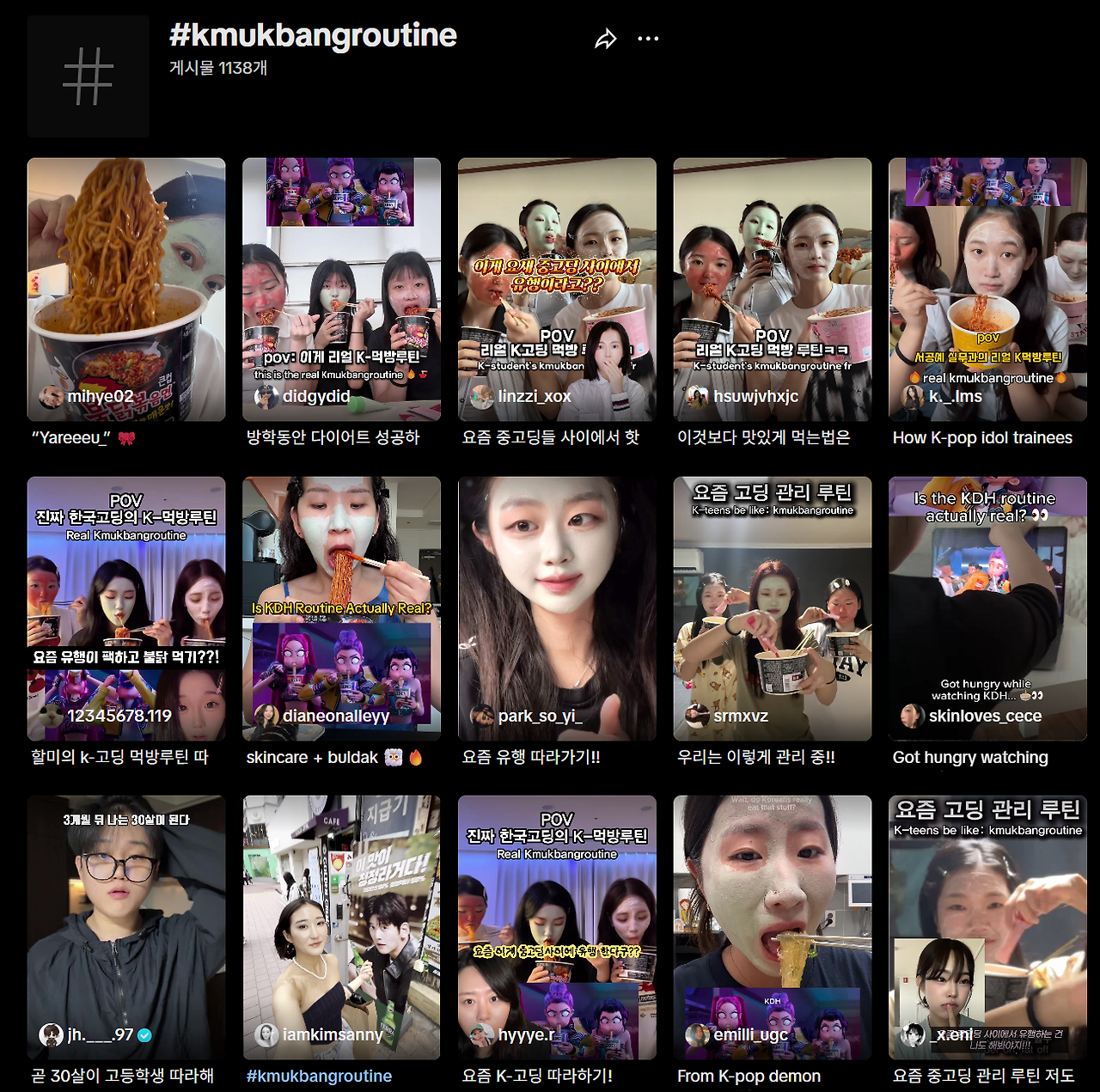 한창 유행 중이었던 "케데헌" 영화 속 먹방하는 장면을 크리에이터들로 하여금 따라하고 유행이다는 느낌을 주는 것이었다. "먹방"이라는 용어는 한국에서 나온 고유어로 영어로도 "mukbang"이었다. 그리고 뷰티 브랜드들 사이에서 한창 유행했던 영상 가이드라인이었던 "피부관리루틴"이라는 부분에서 "routine"을 가져왔다. 그렇게 나온 키워드가 "KMukbangroutine"인 셈이다.