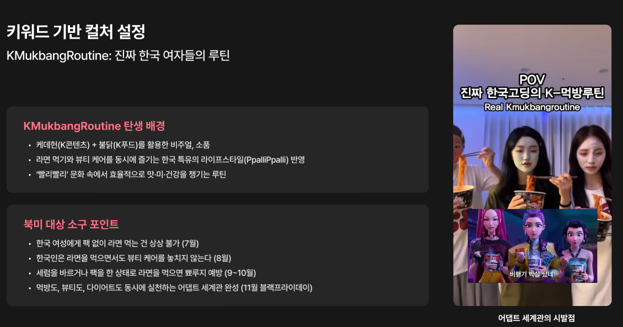 핵심은 '익숙함 속의 새로움'이었다. 유저들에게 익숙한 리듬 위에 우리가 설계한 'k-먹방루틴'을 얹어, 광고가 아닌 하나의 '챌린지'이자 '정보'로 소비되는 구조를 만든 것이다. "한국인들은 야식을 먹고도 살이 잘 안 찌는 루틴은 이거래, 라면을 먹어도 팩클렌져하고나서 세럼 바르면서 피부관리하는 노하우는 이거야" 등으로 소비하는 메세지를 케데헌 음원과 함께 보여주는 것이다. 북미 팔로워나 소비자들에게 자연스럽게 노출시켜서 구체적인 베네핏까지 확장하여 페인 포인트(Pain Point)를 건드리는 전략이었던 것이다.
