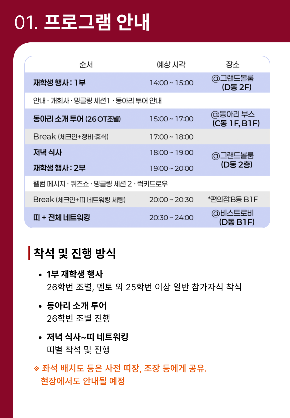 이번이 그랬다. 두 번째 개강총회지만 1학년 때와는 다른 느낌으로, 색다른 역할로 즐길 수 있었다. 학생회를 통해 개강총회 사회를 보고, 부회장으로서 부스도 운영하고, 운영진으로서 농구부(큼바스켓) 홍보를 하다가, 원우로서 OT조와 띠생활까지 즐기는 아주 다이나믹한 개강총회였다.