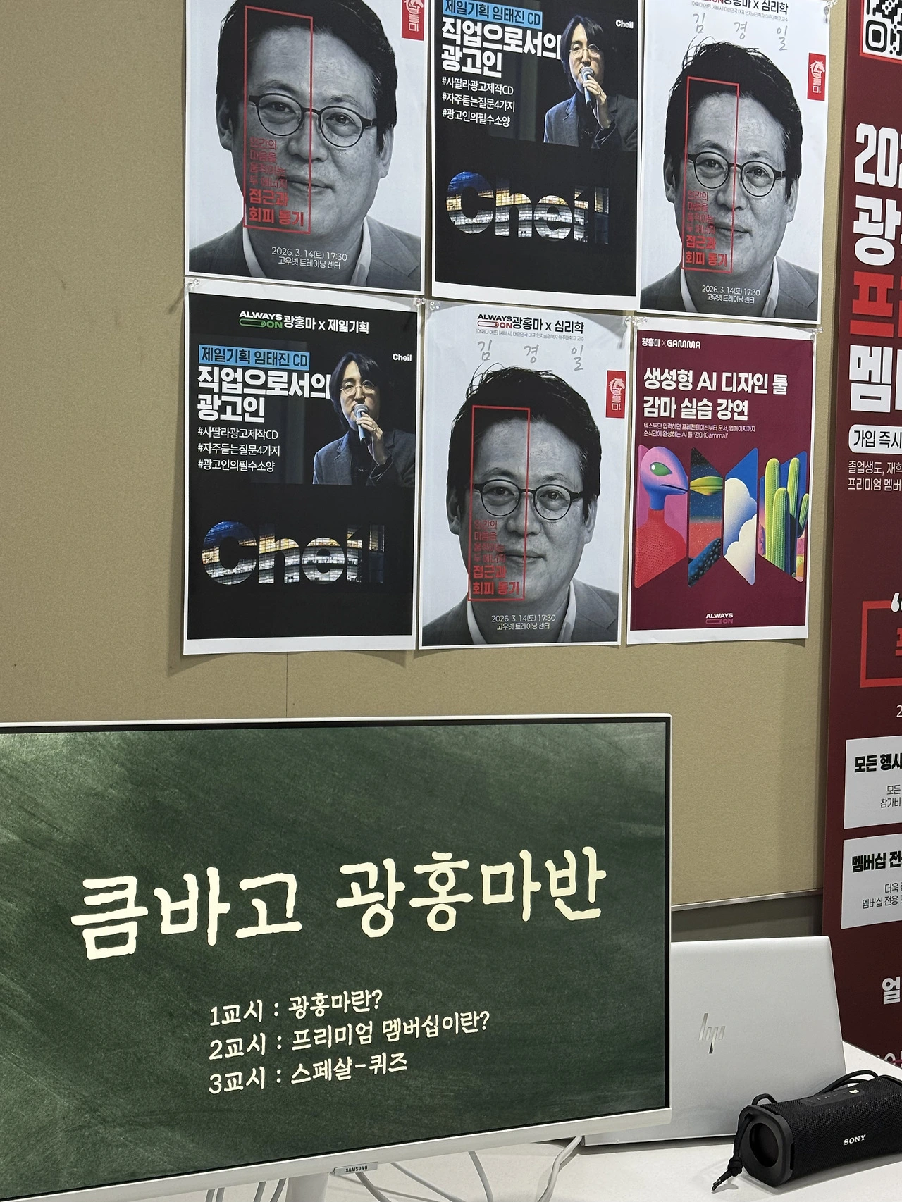 호기심 가득한 눈으로 찾아와주셔서, 광홍마 활동, 올해 목표, 연간 플랜 및 세션, 프리미엄 혜택 등을 안내했다. "재밌어 보여요!", "가입할게요!"라는 반응을 들을 때면 준비한 보람이 한 번에 느껴졌다. 부스를 돌아다니는 것도 즐겁지만, 직접 준비하고 운영하면서 느끼는 보람은 또 다른 차원이다. 2시간 동안 27개 조(약 220여 명)의 신입 원우님들에게 같은 말로 동아리 홍보를 하면서도, 서로 지치다가 응원하고 웃다가도 지쳐하는 반복에 더 끈끈함이 생긴 듯하다.
