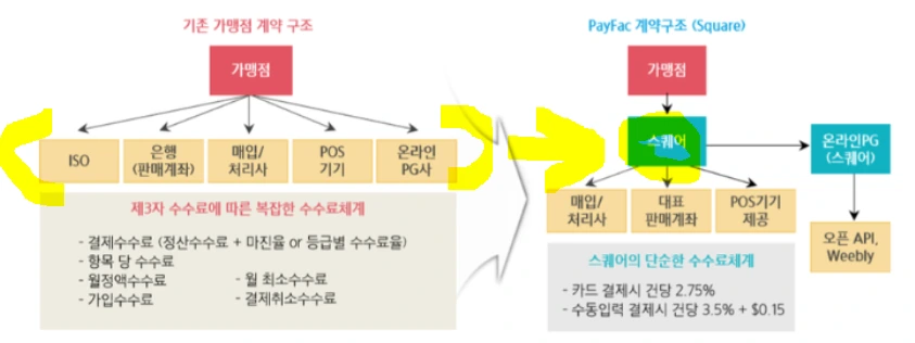 3) 기존 가맹점 계약 구조가 복잡한 수수료 체계이다. 스퀘어가 직접 가맹점을 모집하고 카드 발급과, 매입 역할에 관여해서 가맹점에 POS기를 공급하고 수수료를 얻는 모델이다. 가맹점이 스퀘어한테만 수수료 내면 스퀘어가 알아서 해주는 것으로 바뀐 것이다. 스퀘어가 중간에서 각종 수수료를 대신 내주고 가맹점주와 계약을 맺는 단순한 수수료 체계를 형성하였고 수수료보다 기존보다 저렴하게 측정하였다.