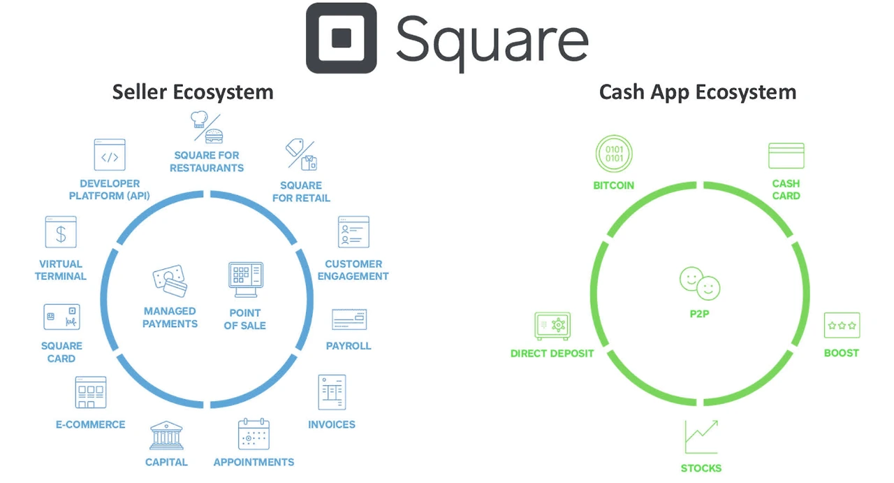 이후 스퀘어는 아이패드와 연결할 수 있는 저렴한 POS기(스퀘어 스탠드, Square stand)를 출시하였다. 여기서 고안하여 더 많은 고객을 확보하기 위해 POS 단말기로부터 수집한 매출 정보/집계를 기반으로 한 결제 생태계를 형성하기로 하였다. 결제 생태계란, 기존의 결제기능에 가게 주인(판매자)이 필요로 하는 서비스를 추가하여 만든 것이다. 예를 들어, QR코드 기반인 기프티콘 카드 제공, 금융 대출 서비스인 스퀘어 캐피탈(Square Capital), 급여지급 프로세스인 스퀘어 페이롤(Square Payroll) 등 올일원서비스로 확대하였다.