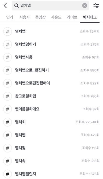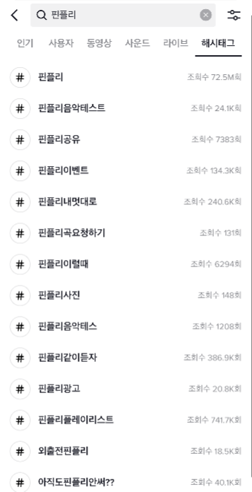 아래는 신규 앱 론칭 후 바이럴 목적으로 집행한 광고이다. 틱톡 내 검색을 눌렀을 때, 관련 검색들이 뜬다는 것이 유저들이 광고 영상 후 '이게 뭐지?'하면서 추가 검색을 하였거나 관련 영상들을 제작했다는 의미이다.