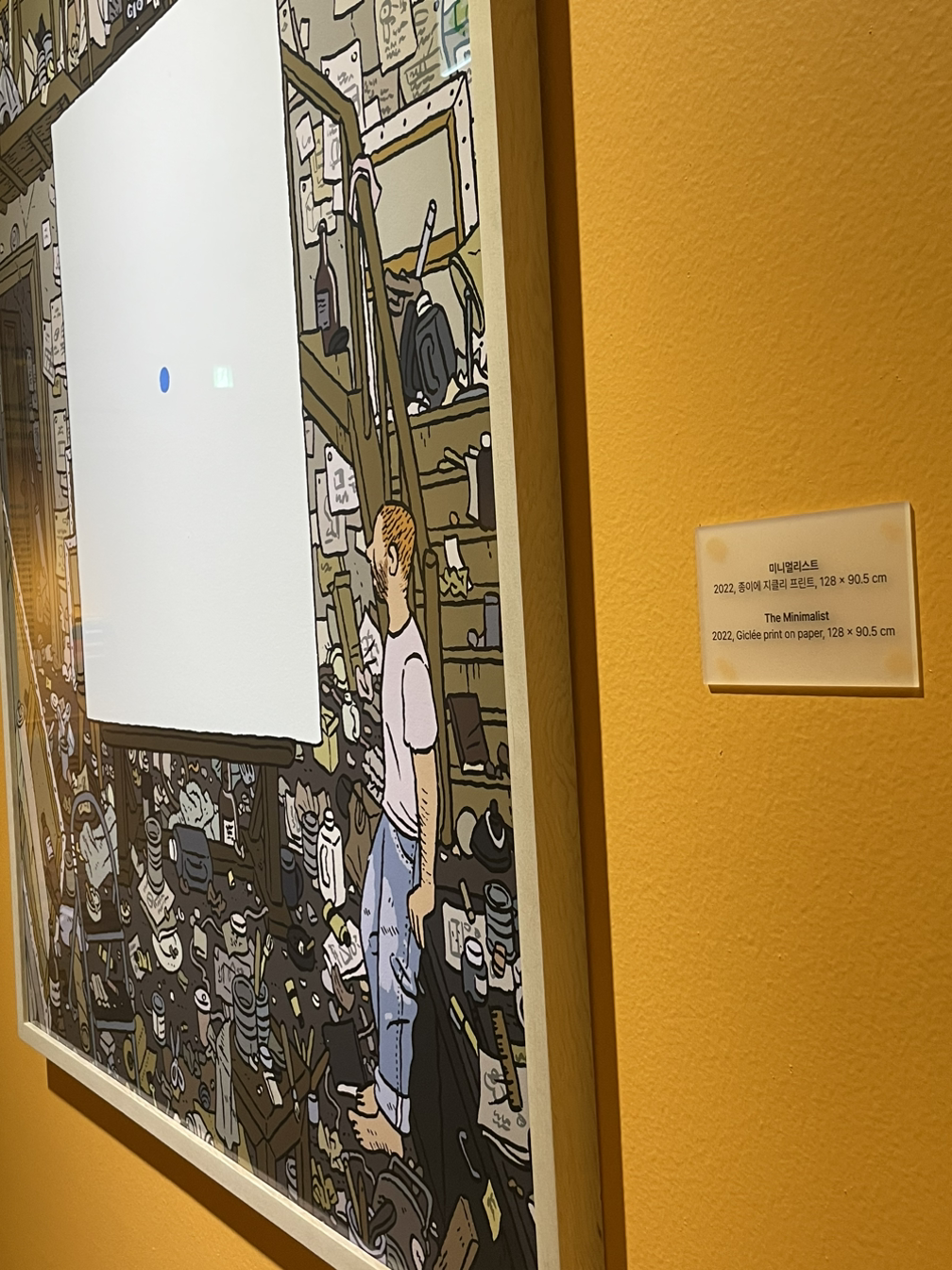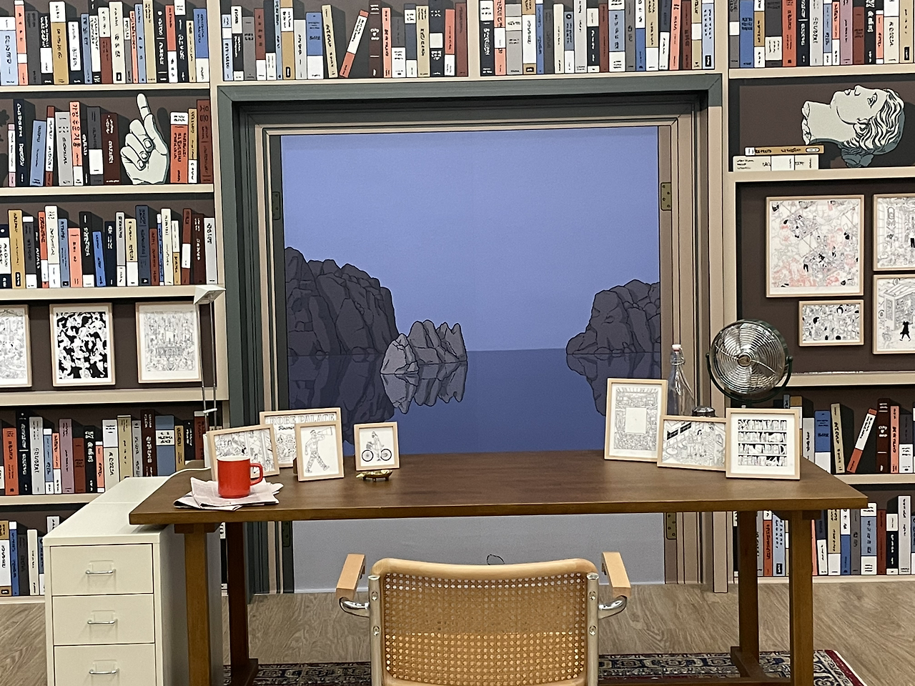 이번 전시는 매우 친근감있으면서 신선한 그런 작품들이 많았다. 애니메이션 캐릭터같은 느낌이 강했고 무엇을 표현하는지 대략적으로 감을 잡을 수 있었으며, 여러 브랜드들과 콜라보한 덕분에 익숙한 작품들도 많았다. 인상적인 부분은 크게 두 가지가 있다. 하나는 창가를 가운데에 두고 서재처럼 만들어서 눈이 오는 배경 혹은 바다 배경, 밤하늘 배경을 나란히 걸어둔 3개 작품이다. 가까이보거나 멀리 봐도 해당 작품들을 보면 침착해진다. 색감자체도 보랏빛, 푸른빛으로 한 분위기를 연출해서 그런가 고요히 보는데도 어떤 생각도 안 들고 멍하니 편안해졌다.