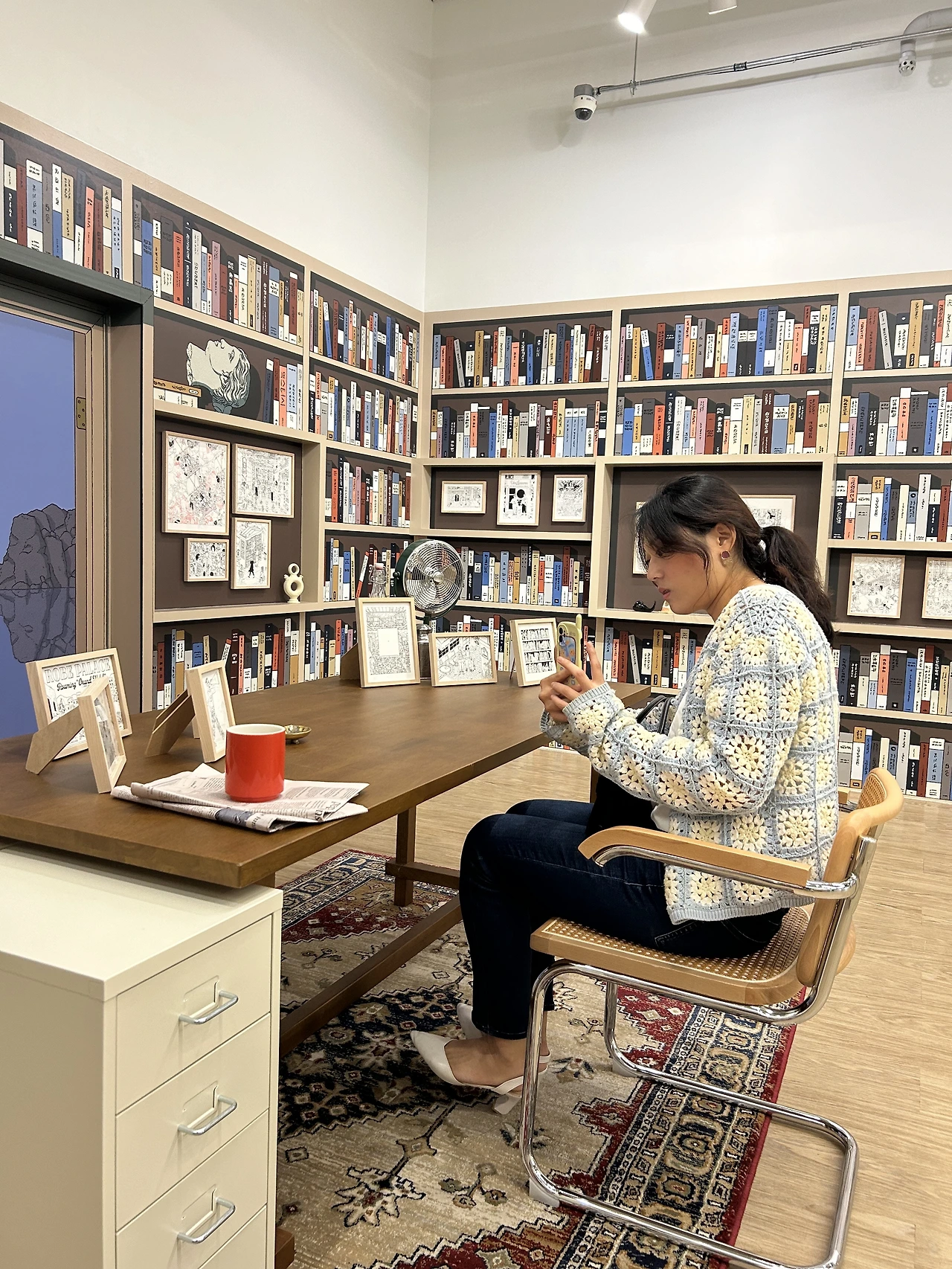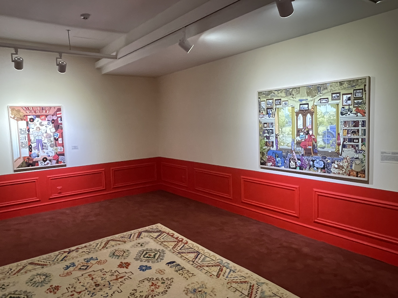 다른 하나는, 방 안의 모습을 위에서 내려본 듯한 작품들이 있는 공간이었다. 흰색과 빨강의 조합으로 공간을 구성하여 딸기 아이스크림이 떠오르는 그런 곳이었다. 어지러운 방 공간을 묘사하면서 해당 방에 누워있는 대상은 노래를 듣거나 편히 쉬는 코지한(cozy) 느낌을 나타냈다. 전반적으로 분홍빛깔을 띄면서 '저런 공간에 가고 싶다'는 생각이 들더라. 여기저기 난잡하게 어지럽히고 아무도 치우라는 잔소리를 하지 않은 그런 평온한 공간 속에 갇히고 싶은 그런 마음도 들었다.