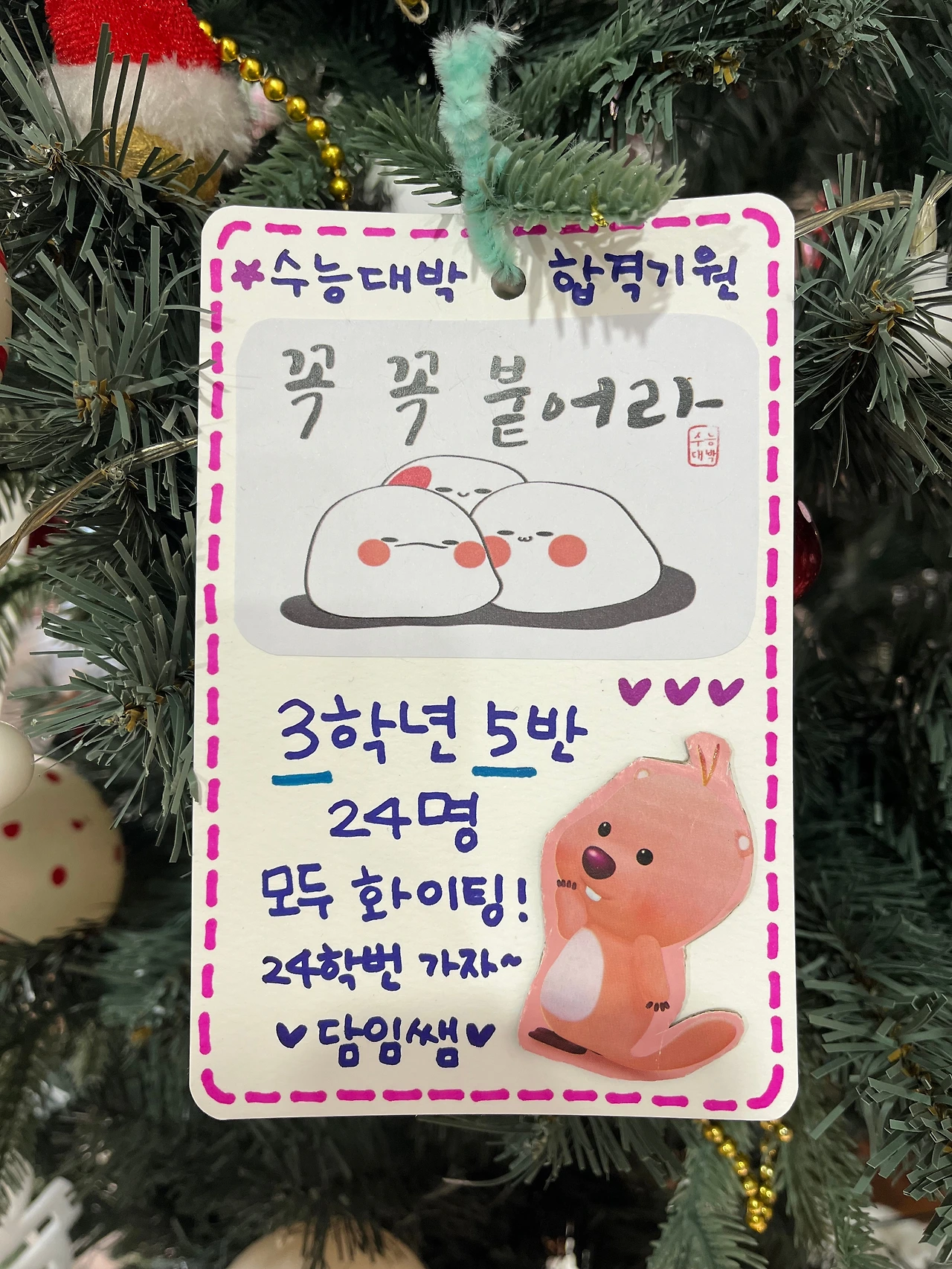 여름방학 후 수시 상담을 통해 대입 수시 지원을 했고, 시간은 흘러 흘러 수능 시즌이 다가왔다. 중앙현관에 수능대박 기원 등도 달고, 트리에 응원카드도 달았다.