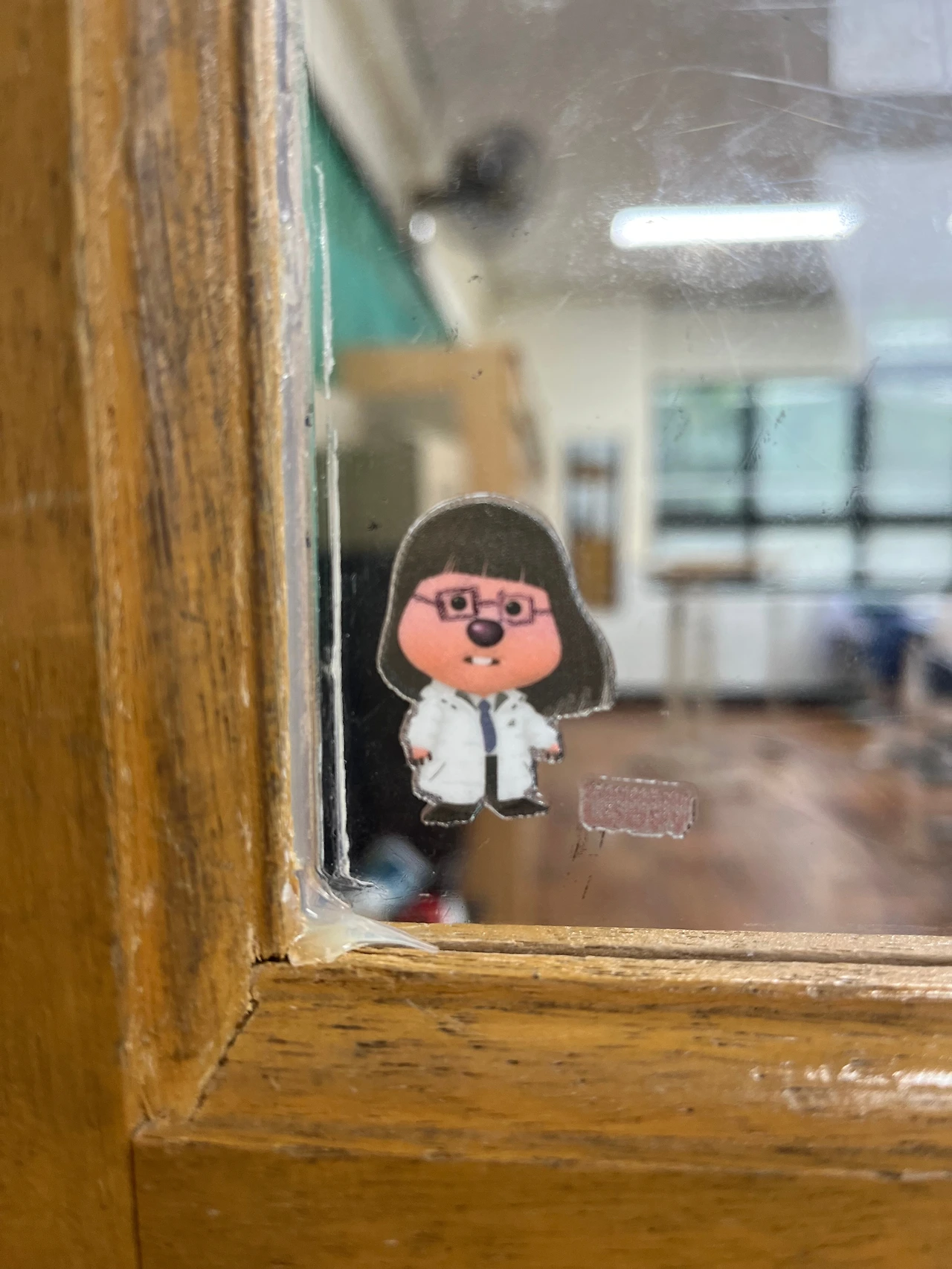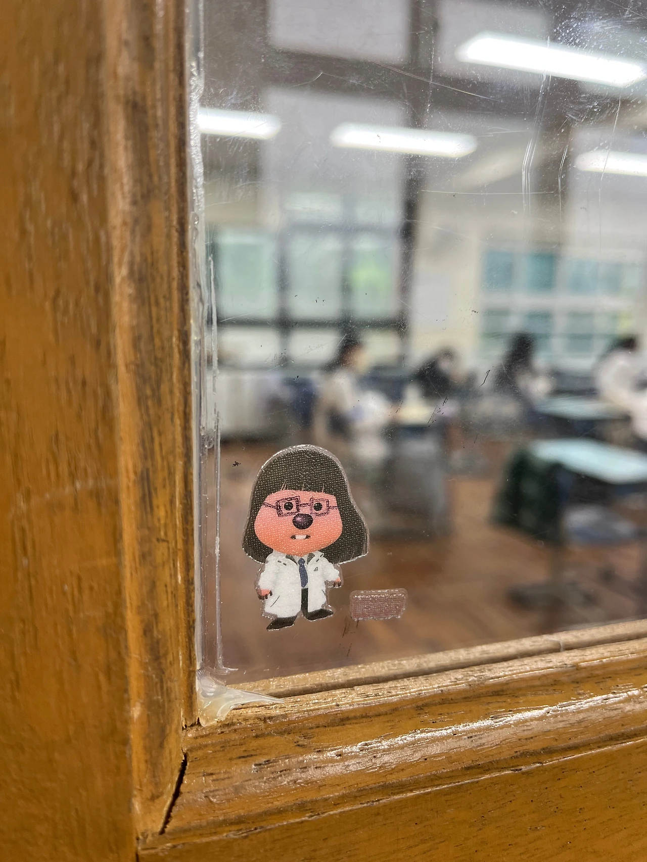 그래도 우리 반 귀요미들은 1년 동안 잘 따라와 주었고, 덕분에 1년을 잘 보낼 수 있었다. 브런치 프로필 사진에 있는 것도 이 아이들이 만들어준 건데 어느 날 실험복을 입고 생물실에서 수행평가를 할 때 그 모습을 보고 애들이 잔망루피랑 닮았다고 안경을 그려서 교실 뒷문에 딱! ㅋㅋㅋ 마음에 쏙 들어서 사진을 찍어두었는데 브런치 작가가 되면서 프로필 사진을 무엇으로 할까 하다가 이 사진이 떠올랐다. ㅎㅎㅎ 고마워!