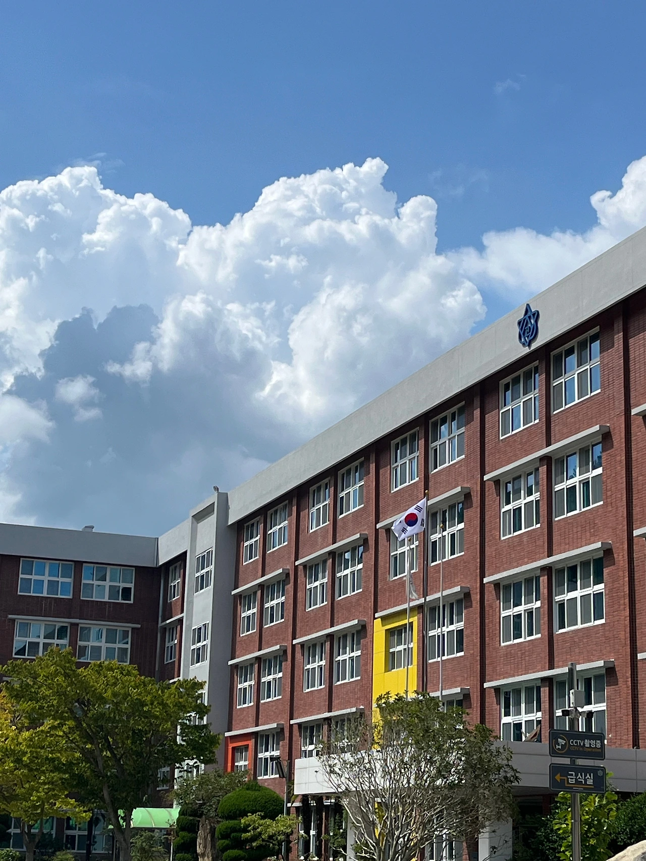 특히 가을에는 예쁜 구름을 많이 볼 수 있어서 좋은데 가을이 오는 줄 알았더니 다시 여름이 와서 9월 중순인데도 이렇게 덥다니... 가을이 오면 점심시간에 학교에 있는 데크길을 산책하면서 하늘과 구름을 볼 시간이 많아질 텐데 더울 때는 산책을 할 수가 없다. 학교에서 많은 시간을 보내다 보니 학교 건물과 함께 예쁜 구름 사진을 찍기도 하는데 아래 사진처럼 정말 잘 찍은 날에는 교무기획부에 가서 교육계획서 표지에 실릴 학교 전경을 찍어왔다면서 보여드리기도 한다ㅋㅋㅋ
