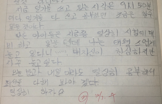잠이 안 오는 날이면 나는 예전에 받았던 손편지나 일기장을 꺼내서 보는 추억 놀이를 하고는 하는데 브런치에 글을 적다가 책장 저 구석에 꽂혀있는 나의 일기장을 찾아 읽어보다가 웃긴 게 있어서 찍어봤다. 초등학생 때 뭔지는 잘 모르겠지만 교육청 주관 시험 전 날이었던 것 같은데 다른 아이들은 지금쯤 열심히 공부하고 있을 텐데 지금 놀고 있는 나 자신이 한심하지만 자꾸 놀고 싶다니... '초등학생 정생물이나 지금의 정생물이나 비슷하군.' 이런 생각에 웃음이ㅋㅋㅋ