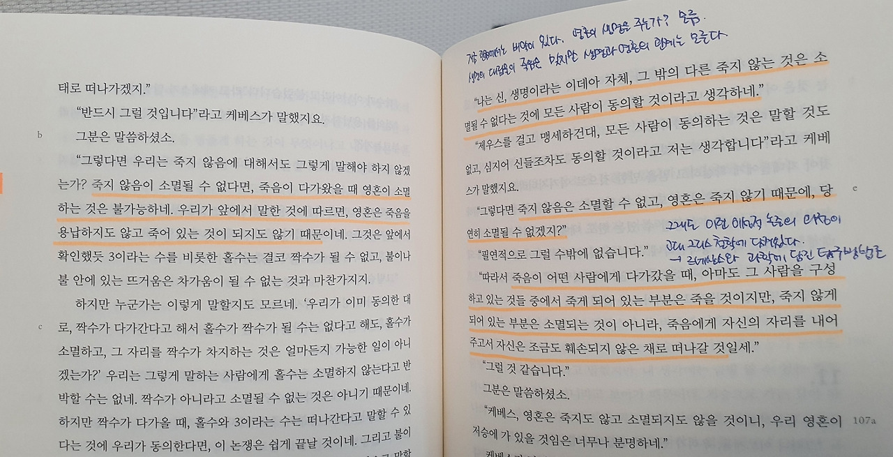 '죽음 이후에도 영혼이 존재하는가'에 대한 소크라테스의 논증이다. 이 부분은 태어나기 이전에 대한 내용보다 어렵기도 했고, 납득이 되지 않았다. 그래도 이런 이성적인 시도들이 중세 이후 유럽을 융성하게 했던 것 아닐까 생각이 들었다.