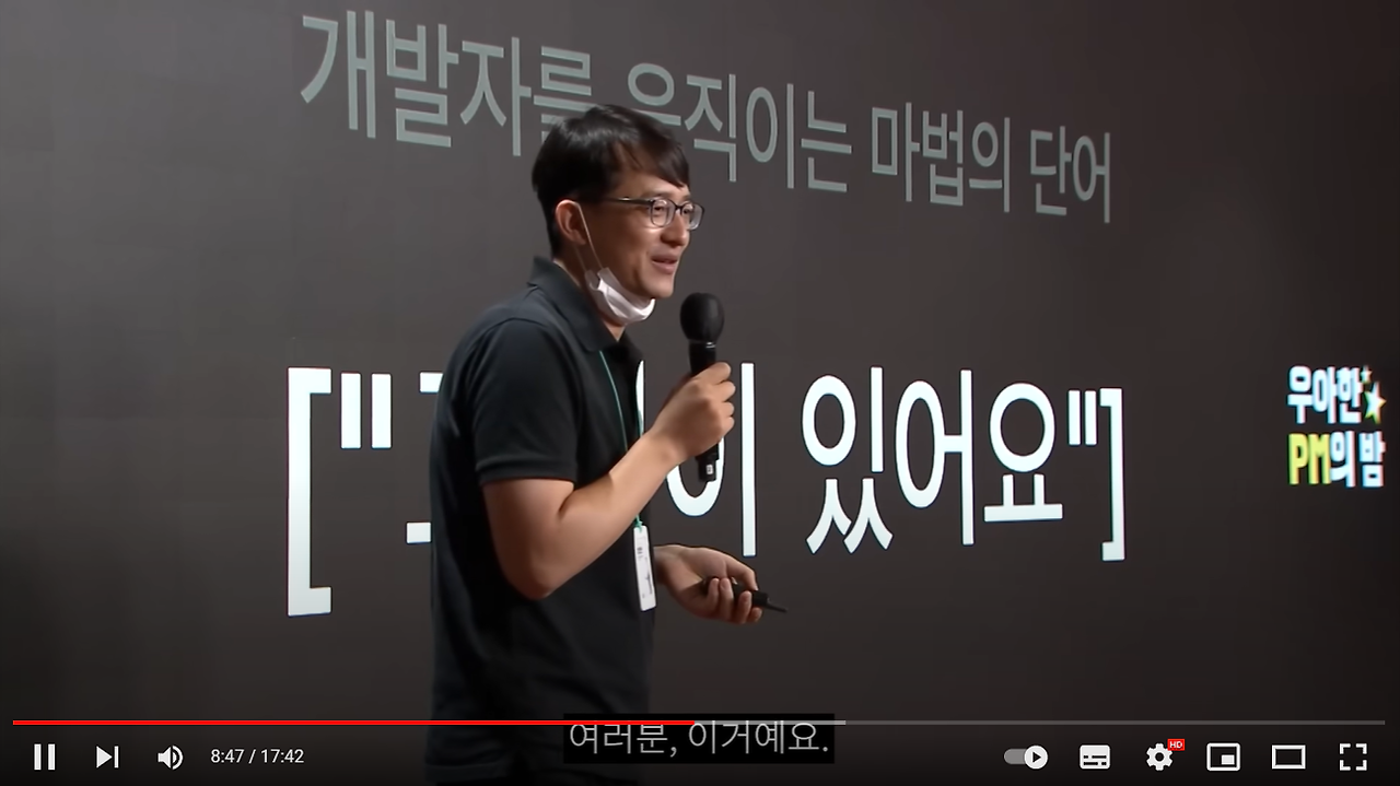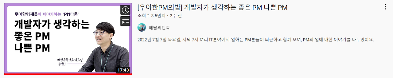 아침에는 보통 책을 읽으려고 노력하지만 가끔은 영상을 본다. 영상도 심각한 것은 보지 않는다. 출근 전에는 생각이라는 것을 하고 싶지 않아서다. 그런데 오늘은 어쩌다 알고리즘으로 뜬 '우아한PM의밤' 컨텐츠에 이끌려 보게 되었다.