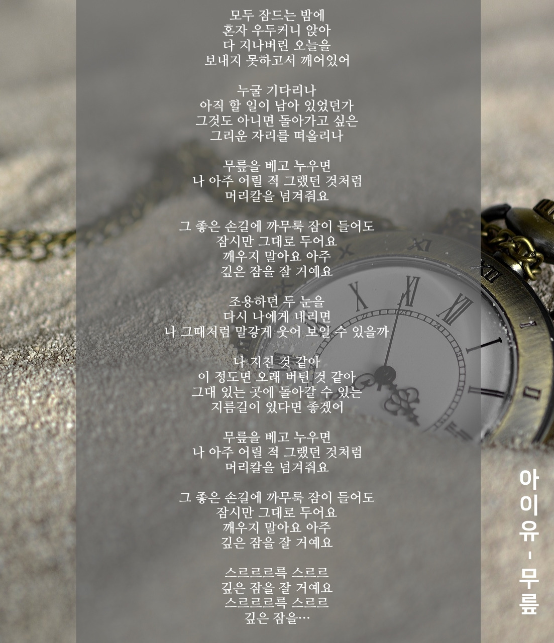 오늘도 여전히 모두가 잠든 밤에 나 홀로 눈을 뜨고 있다. 하지만 왜 그런지 모르게 편안하다. 노트북 화면에는 글씨가 채워지고 있다. 아이유의 노래 <무릎>을 연속으로 재생시켜 놓았다. 노래를 들으며 더 깊어질 밤을 기다리는 것도 괜찮을 것이다. 나를 껴안아준 딸아이의 두 팔 이불을 떠올리면 오늘은 부드러운 선율처럼 스르르륵 잠들 것이다. 어제와 똑같은 서늘한 새벽 공기에도 포근한 온기가 느껴지는 것 같다. 마치 그때처럼.