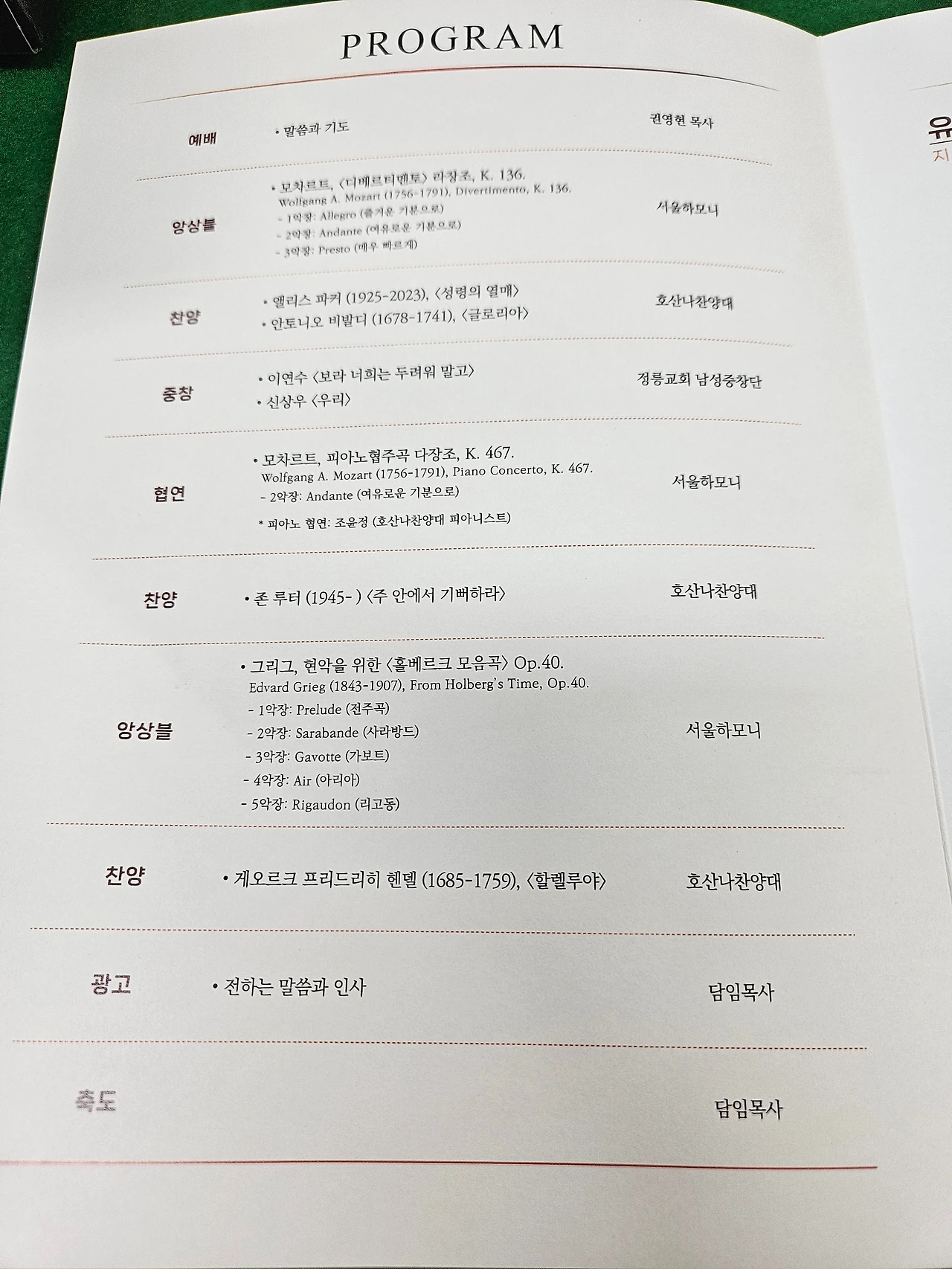 연주곡목은 모차르트 디베르티멘토K.136, 그리그 홀베르그 모음곡 , 모차르트 피아노 협주곡 ,비발디 글로리아, 헨델 할렐루야,루터의 곡,주의 기도 등을 연주했습니다.