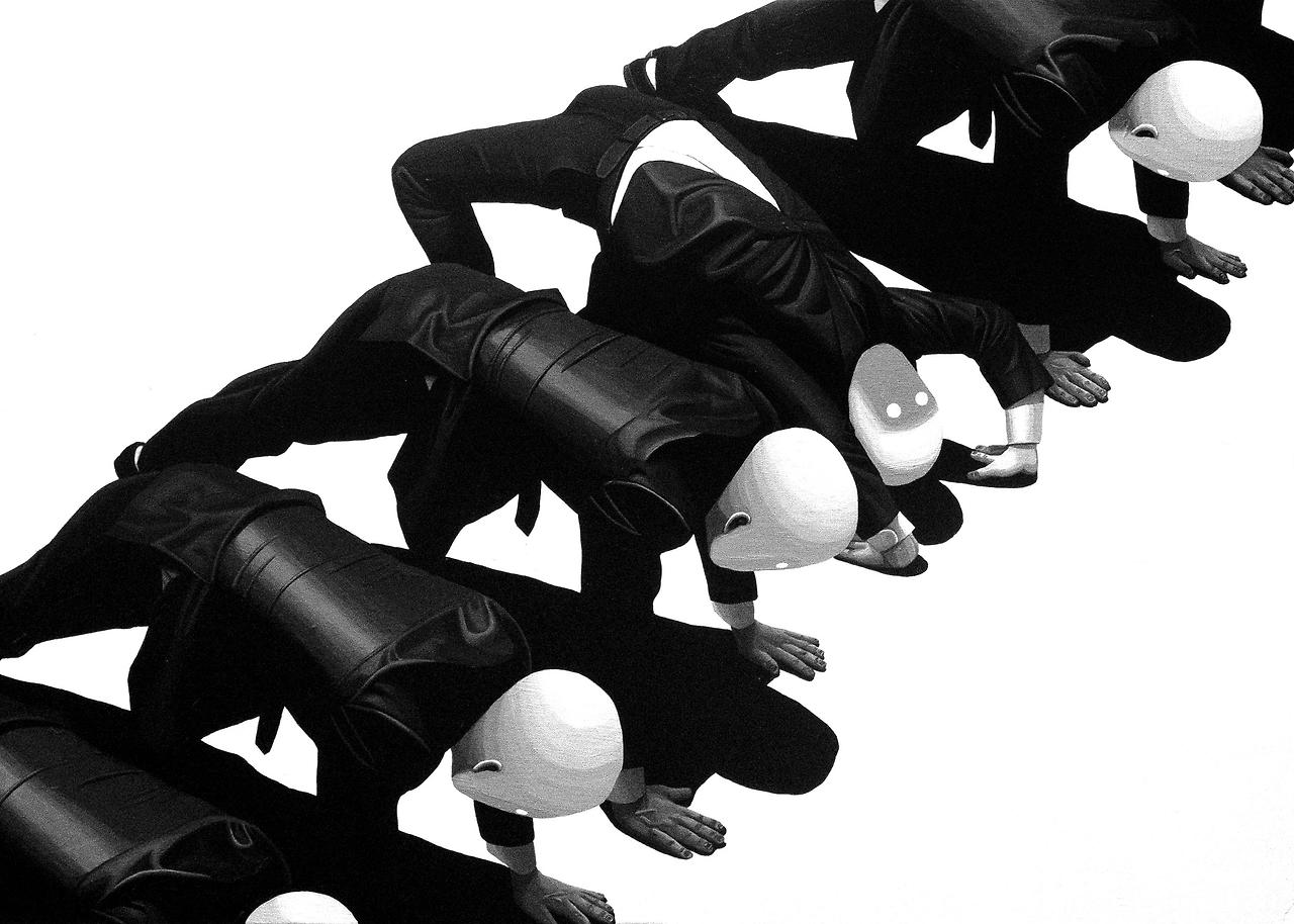 '맨날 나만 달라'는 바로 이 감정의 구조를 시각적으로 그려낸 작품이다. 화면에는 동일한 복장을 한 인물들이 엎드려뻗쳐 자세로 나열되어 있다. 그런데 그사이 단 한 사람만이 반대 방향으로 몸을 젖힌 브리지 자세를 취하고 있다. 얼핏 비슷한 맥락 속에 있는 것 같지만, 실은 전혀 다른 신체적 조건을 감수하고 있는 이 인물은, 그 자세 하나로 자신이 얼마나 불편한 처지에 놓여 있는지를 말해준다. 이는 다수와 다른 선택을 한 이들이 느끼는 심리적 고립과 신체적 긴장을 상징한다.