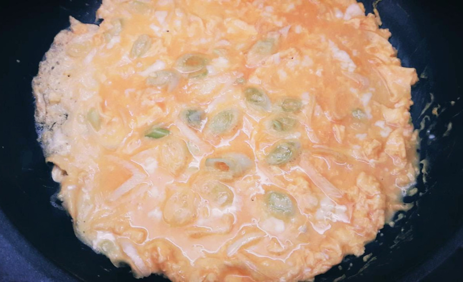 달걀물을 촥 부은 뒤 팬 바닥의 열기가 닿자마자 재빠르게 달걀물이 숨 쉴 수 있는 구멍들을 만들어 주는 것이다. 나무젓가락으로 톡톡 찍으면 된다.(이 행위 자체가 요리 좀 하는 사람 같은, 기분 좋은 느낌이 들게 한다)
