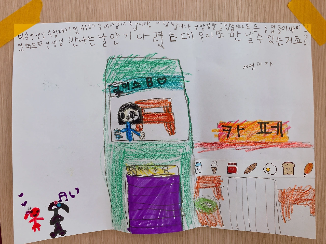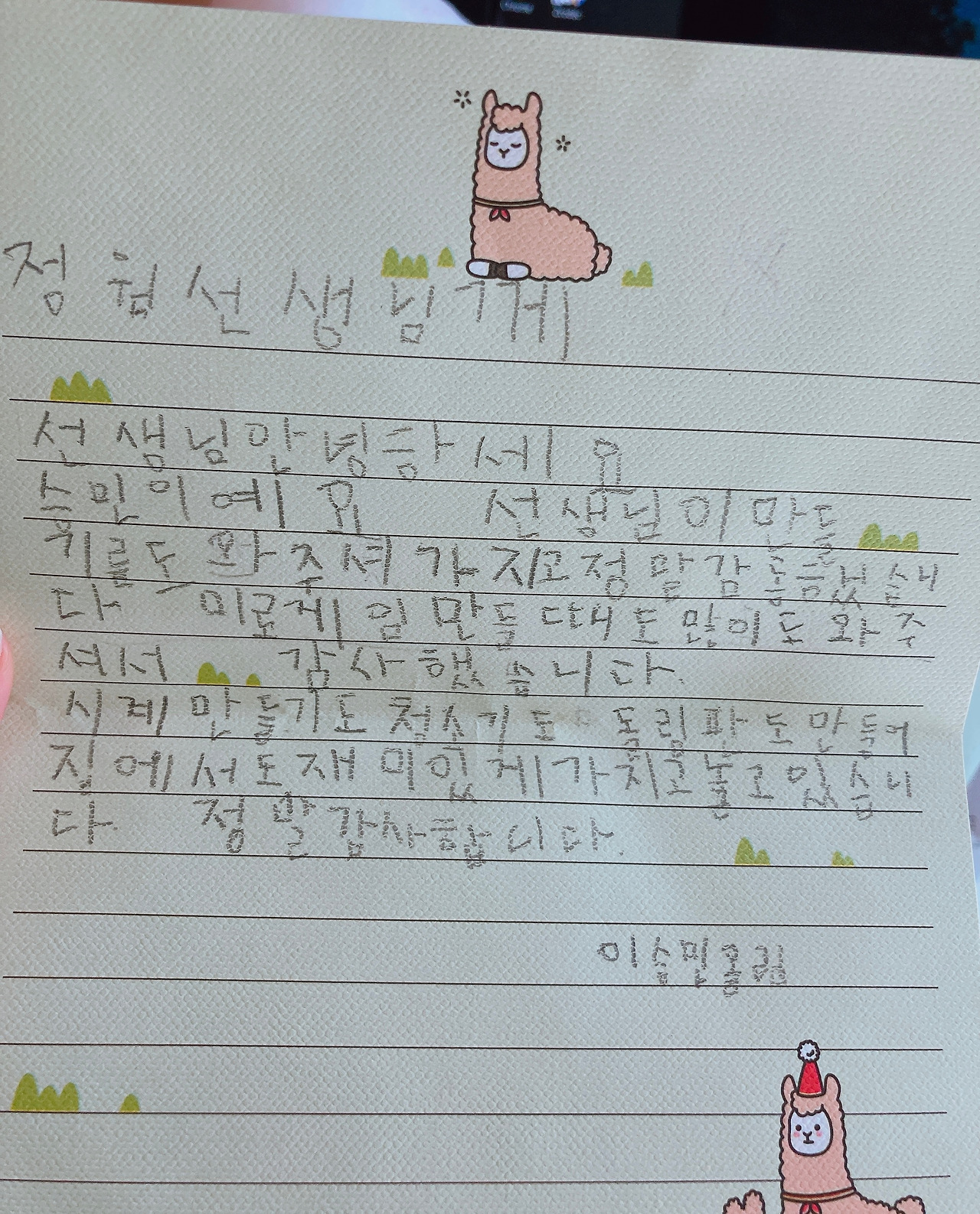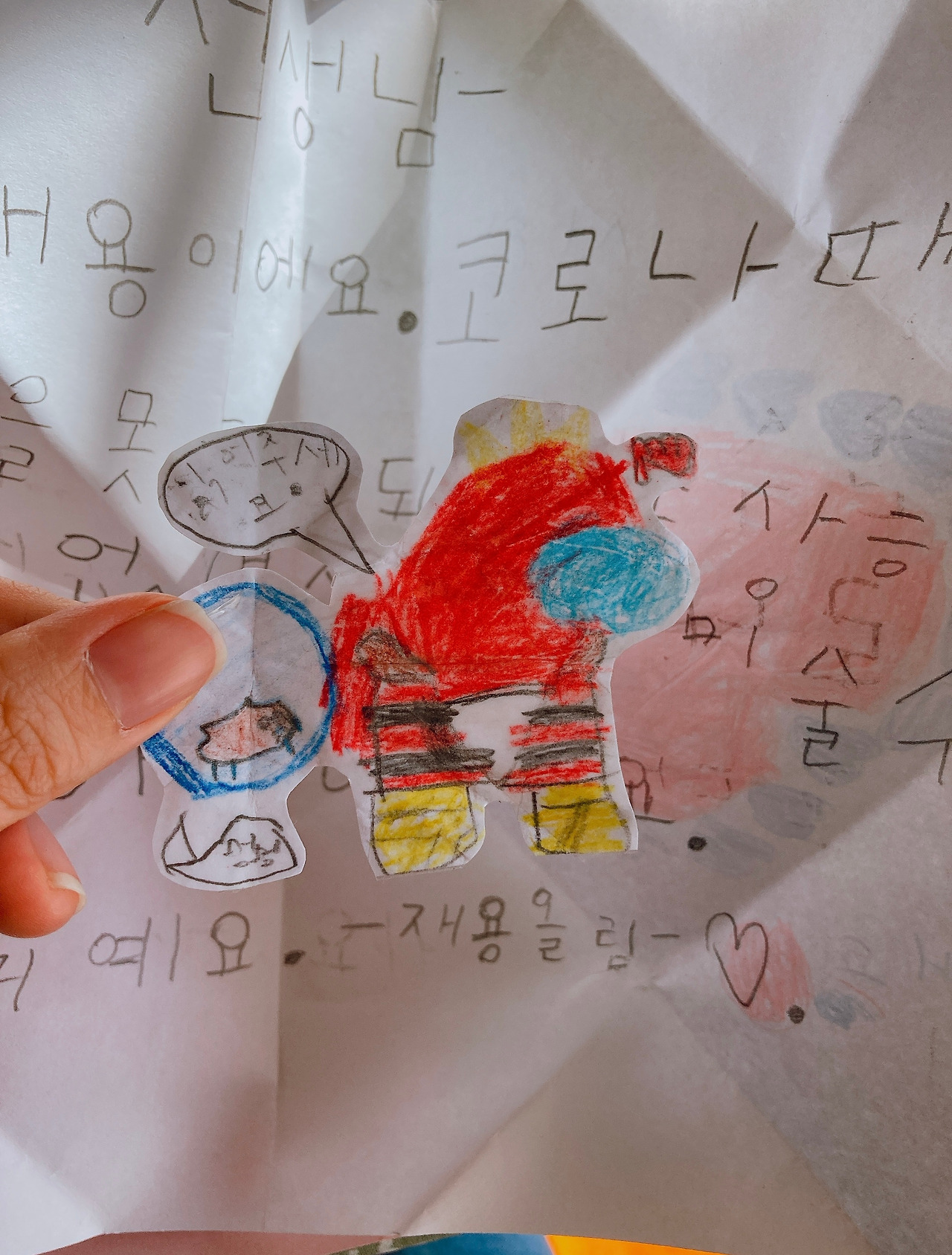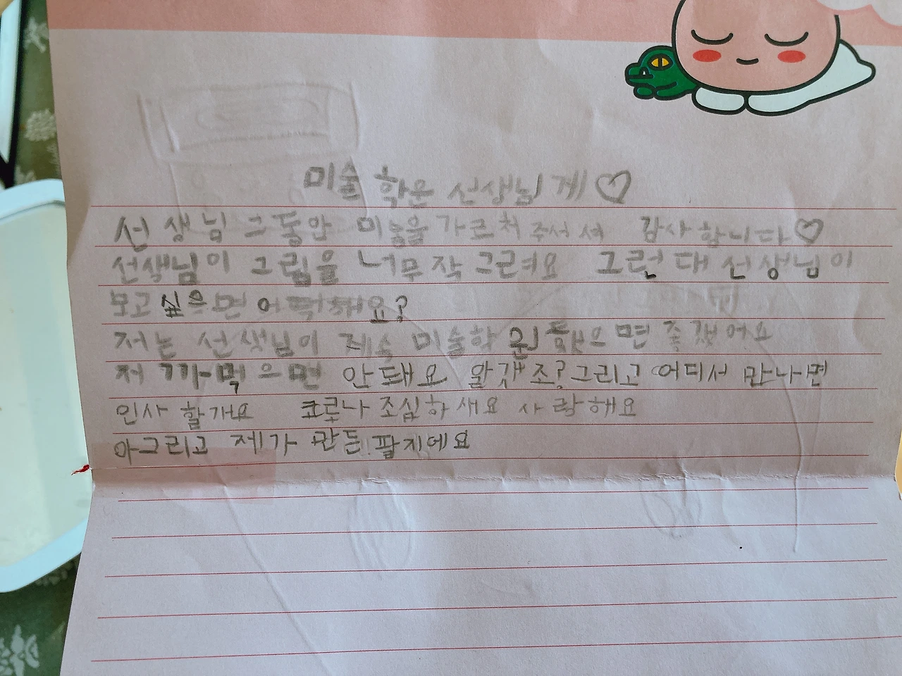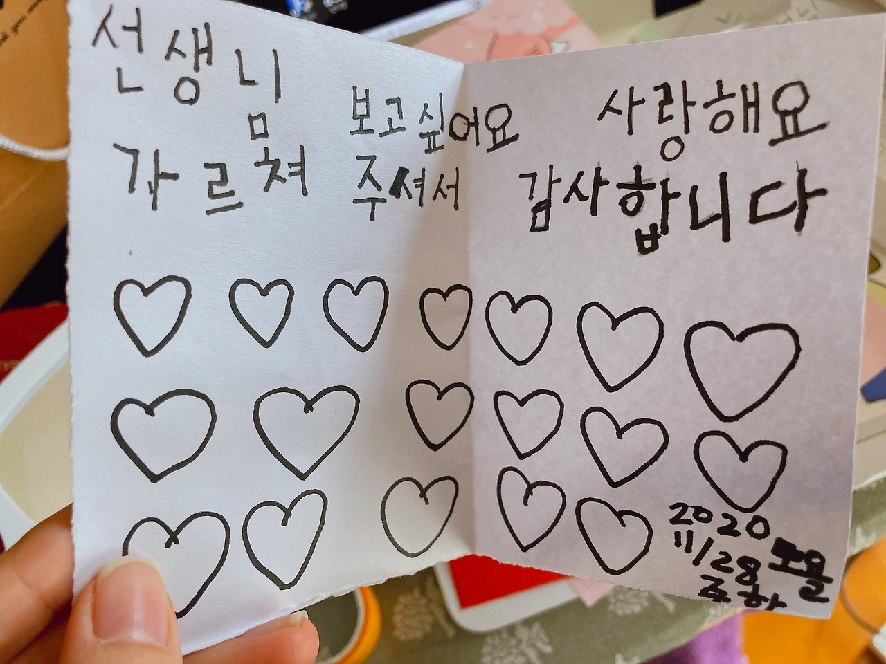 아이들이 집에서 내가 써준 편지와 사진을 보고 좋아하기도, 나처럼 울기도 많이 해서 다시 답장을 준다며 갑자기 학원에 와서 편지랑 선물을 주고 갔다. 쑥스러워하는지 선생님 얼굴만 계속 보고 쭈뼛거린다. 친구 집에서 하루 종일 놀다가 집에 와서 편지를 읽고 하염없이 울었다는 어머님 톡을 확인하고 나도 일끝 내고 액션 영화 보며 긴장을 풀고 있다가 엎드려 울어버렸다.