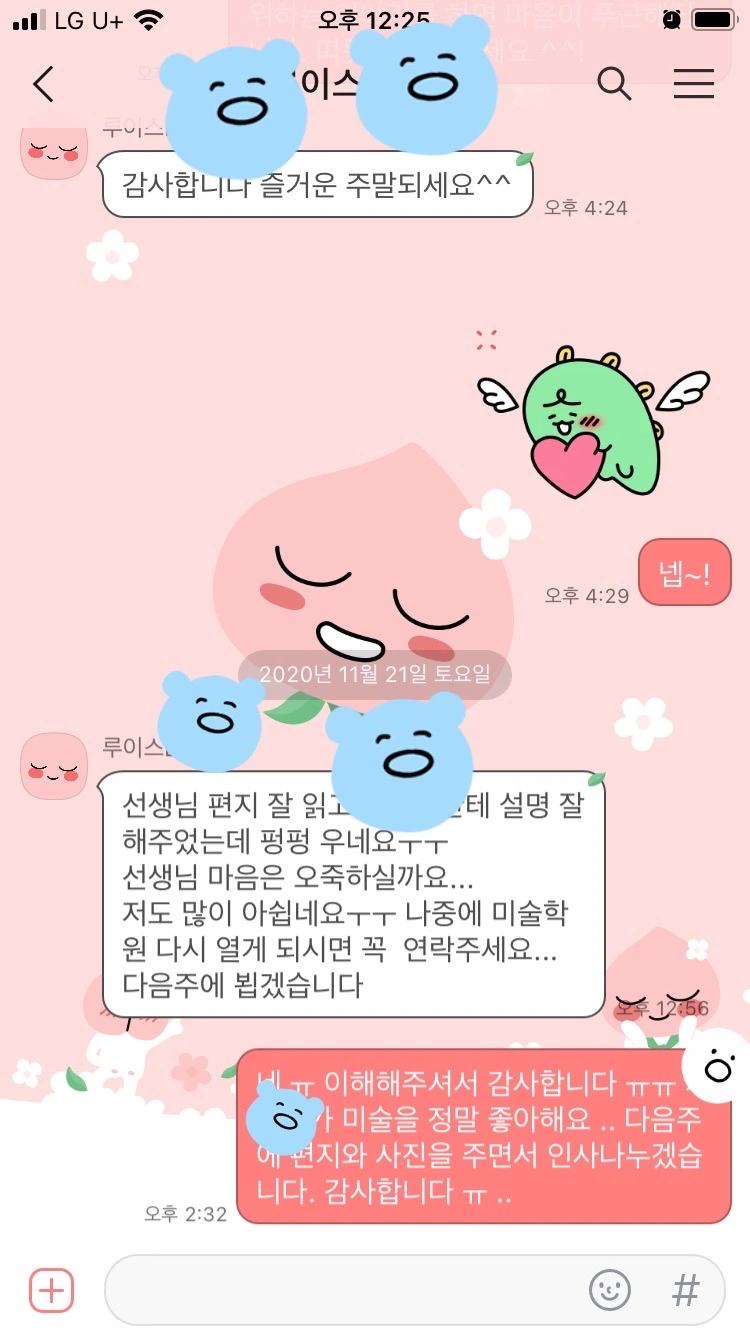 운영은 .. 강사 일과 성격이 달랐다. 강사는 ‘나’에서 일을 마무리지을 수 있지만, 운영은 가족들 도움이든, 커뮤니티 등 주변의 도움 없이는 운영하기 힘들다. 아무래도 최종 결정권이 있는 사람이 나이기 때문에, 나의 선택에 의해 모든 것이 좌지우지된다. 그래서 그것이 과연 옮은 결정일까를 생각하는데 시간이 많이 걸린다. 학원 이미지와 재정적인 부분을 항상 고려해야하기 때문이다. 미술학원경영 관련 네이버 카페에서 관련 종사자분들의 의견을 최대한으로 수렴한다. 계속해서 동네 원장님들께 SOS를 칠 수 없으니.. 미술학원인 만큼, 작은 이벤트들이 많아, 소소하게 가족들 도움이 종종 필요하다. 그리고 건물 관리인, 인테리어 업주 분들 등등 조율해야 하는 사항들이 예측하지 못하는 시점에서 일어난다. 그래서 감사함을 많이 느꼈던 시간이기도 하고, 내 시야를 넓히는 계기도 되었지만, 계속 사람들과 함께 일을 벌이고 일을 마무리 짓는 시간들이 혼자 책 보고 그림 그리는 시간을 좋아하는 나로서는 맞지 않는 옷처럼 힘들었다. 큰 규모의 학원이어도 직원분들이 있음에도 주말이면 가족분들이 와서 대소사일을 도와주신다. 학원 일을 자기 일처럼 도와주시는 가족분이 계시면 정말 든든하다. 하지만, 나는 미혼이라, 내 일처럼 도와줄 수 있는 남편이 있는것도 아니었고, 각자의 일이 바쁜 가족구성원들의 특성과 남에게 잘 부탁 못하는 내 성격상, 계속 시간을 쪼개어 학원일을 도와주는 가족들에게 계속 미안해져갔다.