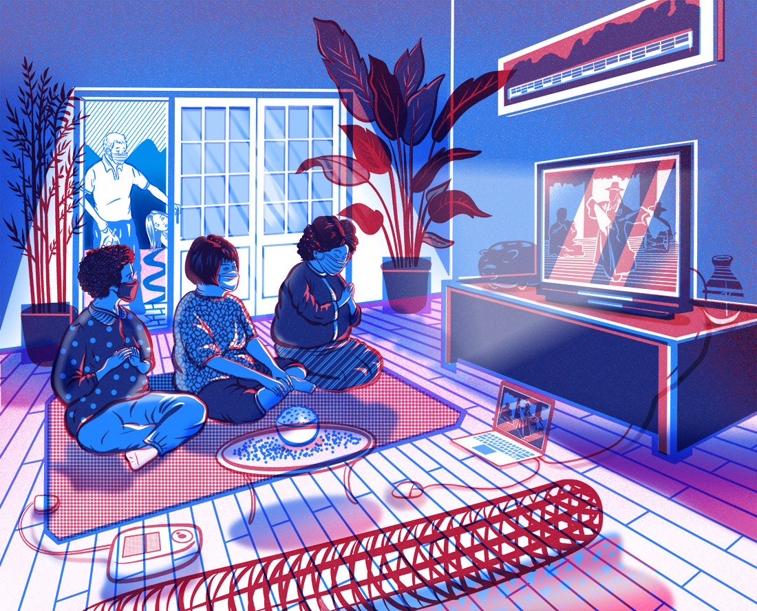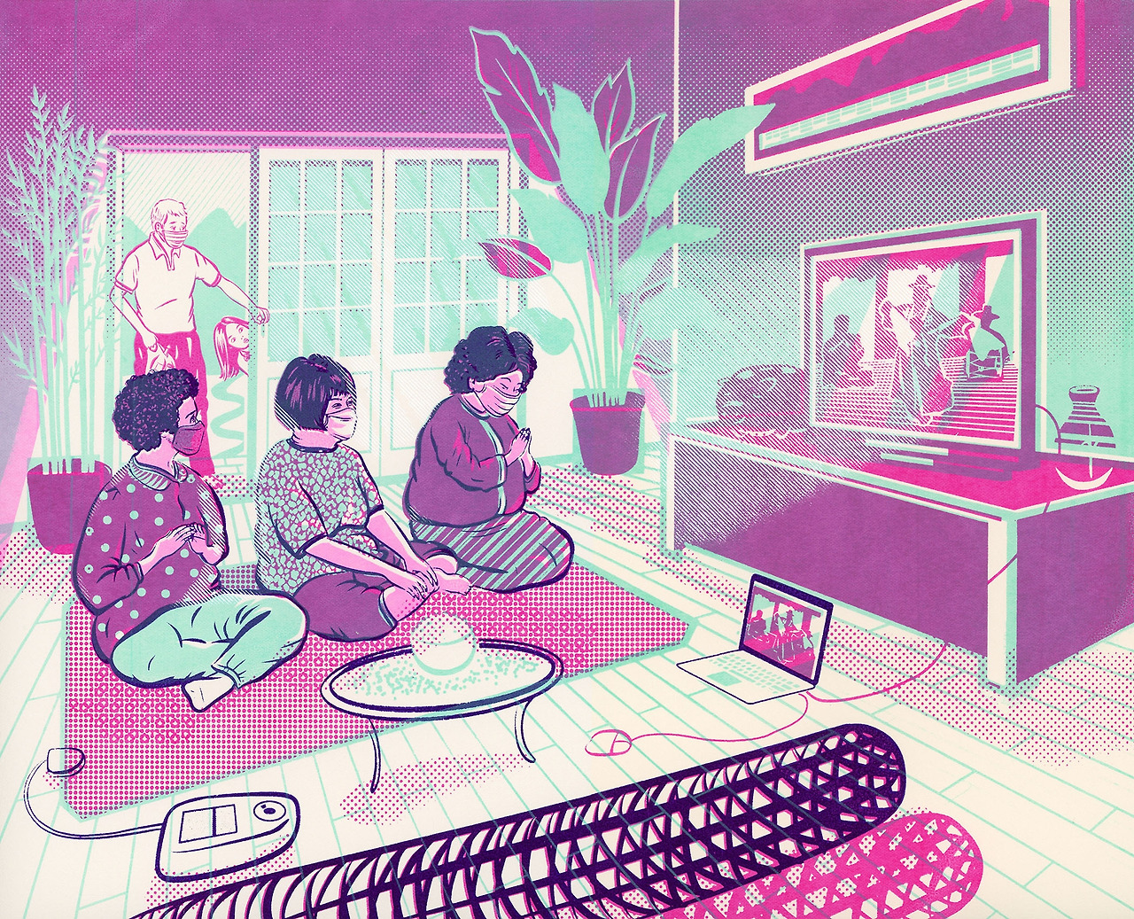 The reinterpreted painting is set in a country house during the height of COVID-19. Indoors, three women wearing masks perform an online exorcism using a small laptop connected to a TV monitor. Despite the online setting, the seriousness of the ritual is evident with a rice bowl and grains of rice placed on a small table. The man and the little girl who suddenly open the door gaze at the scene in surprise. The Dutch wife, the electric blanket, the piggy bank, and plants larger than people reflect the atmosphere of the house and the personalities of the characters.