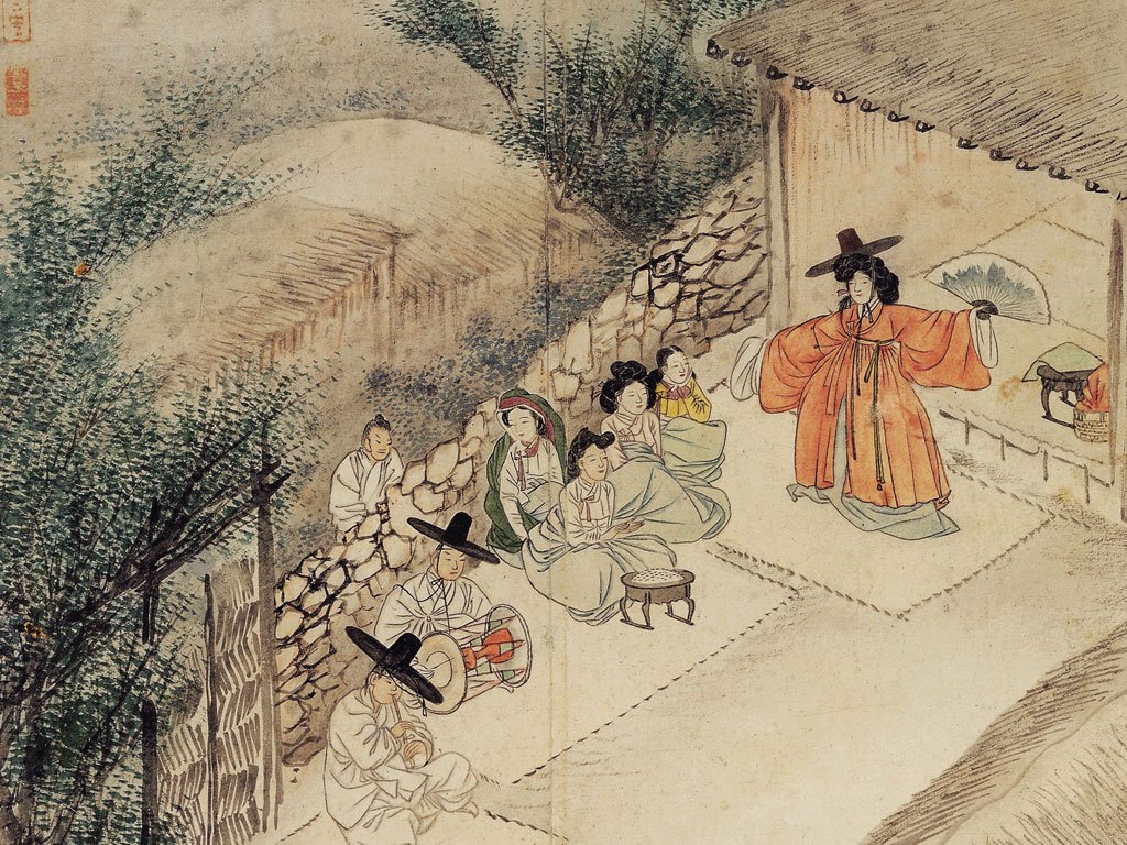 An intriguing aspect of this work, captured from an overhead perspective, is the woman in the green robe skirt seating on a stone wall. She seems to be making eye contact with the man behind her. Was this scene, perhaps, a moment where, during a ritual performed by her mother-in-law for her daughter-in-law unable to bear a son, she was actually connecting with another man? While a 'Shinmu(神舞)' typically means 'dancing as if possessed by a spirit, ' the shaman in the picture appears distant from a 'possessed dance' or 'hanpuri.'