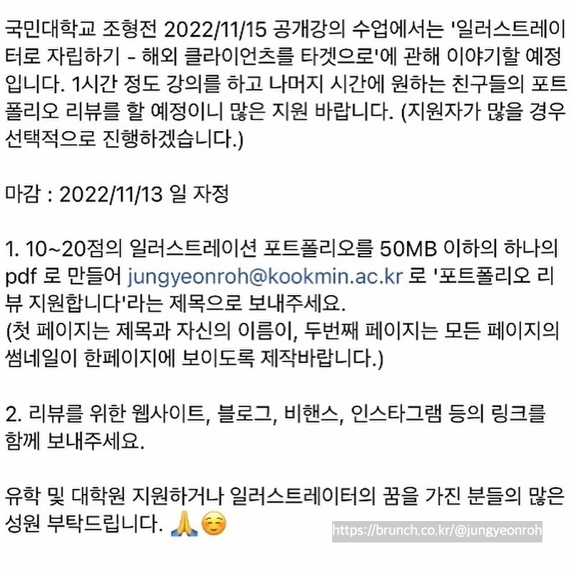 저는 시각디자인학과 겸임교원으로 돌아오는 화요일 2022/11/15 오후 2시부터 오픈 클래스를 합니다. 주제는 일러스트레이터로 자립하기 - 해외 클라이언츠를 타깃으로 에 관해 이야기할 예정입니다. 팬데믹 이후에 더욱 활발하게 국내에서 뉴욕타임스, 뉴요커를 포함한 세계 주류 클라이언츠를 상대로 일을 하는 일러스트레이터들이 하나둘씩 늘어나는 추세입니다. 제가 유학 갈 당시만 해도 '유학'이외에는 이러한 해외 클라이언츠들과 일할 방법이 없어 보였는데 세상이 너무 좋아졌습니다. 우리 한국인들의 그림 실력은 세계 어디를 가도 뒤지질 않으니 당연한 일입니다. 그래서 조금 더 가성비 좋게 국내에서 탄탄한 포트폴리오와 플랫폼들을 이용하여 가족, 친구, 사랑하는 이/음식/장소/강아지와 생이별하지 않고 똑똑하게 일을 시작하는 방법에 대해 이야기해보려 합니다. 물론, 시간차를 다투는 직종이라 현지에 있는 일러스트레이터들을 아무래도 선호할 수밖에 없긴 하지만요.
