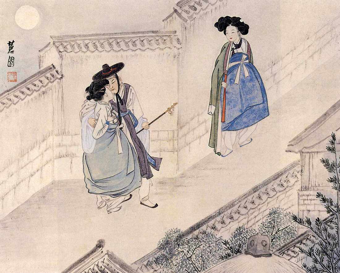 둥근 보름달이 뜬 밤, 부감법을 사용하여 사선방향에서 위에서 아래를 내려다본 구도로 한 골목의 풍경을 보여주고 있습니다. 달이 밝게 뜬 걸로 보아 이미 통금시간은 지났고 살짝 굽어진 담 아래서 한 남녀가 은밀히 얼굴을 붙이고 끌어안다시피 하고 있네요. 이 광경을 꺾어진 담벼락에서 한 여인이 들킬세라 몸을 바짝 붙이고 발끝까지 긴장을 놓지 않은 채 벽에 붙어 지켜보고 있습니다. 남성은 손에 든 막대로 보아 장교나 포교로 보이고 여성은 푸른색 저고리 소매 끝동을 보아 유부녀입니다. 이 그림에 관해서는 세 사람이 삼각관계이다, 사랑을 이루지 못한 두 연인의 재회를 위해 한 여인이 망을 봐주고 있는 것이다 등으로 해석이 나누어집니다. 그러나 저는 망을 봐주고 있다는 것에 조금 더 무게를 싣고 싶은데요, 이는 오른쪽 여성이 숨어서 본다기엔 너무 조용한 골목에, 그리고 너무 잘 보이는 곳에 있습니다. <단오풍정>등에 등장하는 몰래 훔쳐보는 동자들이 나무 뒤에 몸을 숨기고 보는 것과 비교했을 때 말입니다. 어찌 되었든 이 그림 안에는 무언가 안타까운 사연이 있는 것은 분명해 보입니다.