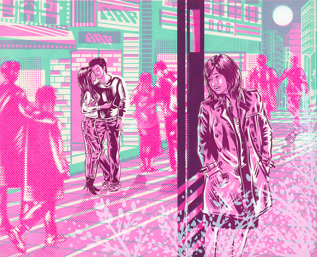 The reinterpreted work is set in the bustling entertainment district where people are lively even late at night. Despite the original notion of someone watching over, in the modern context, there is no reason for such vigilant observation. Therefore, I've shaped their story into a 'love triangle.' Beneath the moonlight, a woman hides beneath a utility pole, observing a scene where her boyfriend or husband is indulging in a secret rendezvous with another woman. It seems like she might be trying to capture evidence with the mobile phone in her hand.