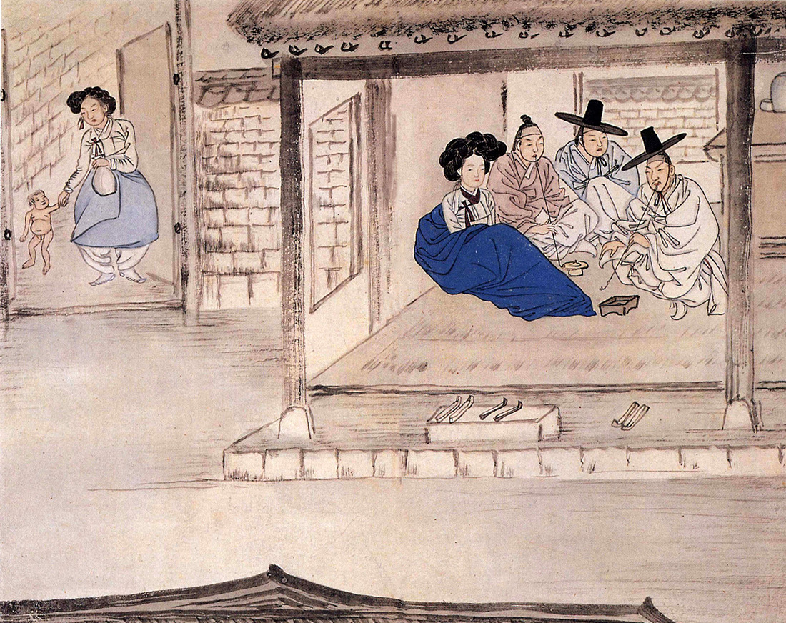 Revealing that the entering child is a girl adds another layer to the interpretation, hinting at the future of a child born in this place. The titles of the 30 works in the "Hye-won jeon-sin-jeop", attached by an unknown author, have led to criticisms of unclear origins, possibly resulting in incorrectly assigned titles. In China, the categorization of entertainment places as 'Chungru(a blue roof)' and 'Hongru(a red roof)' is interesting, with 'Hongru' serving as an entertainment venue and 'Chungru' functioning as a pub with entertainment. However, during the Joseon Dynasty, there wasn't a clear distinction between the two.