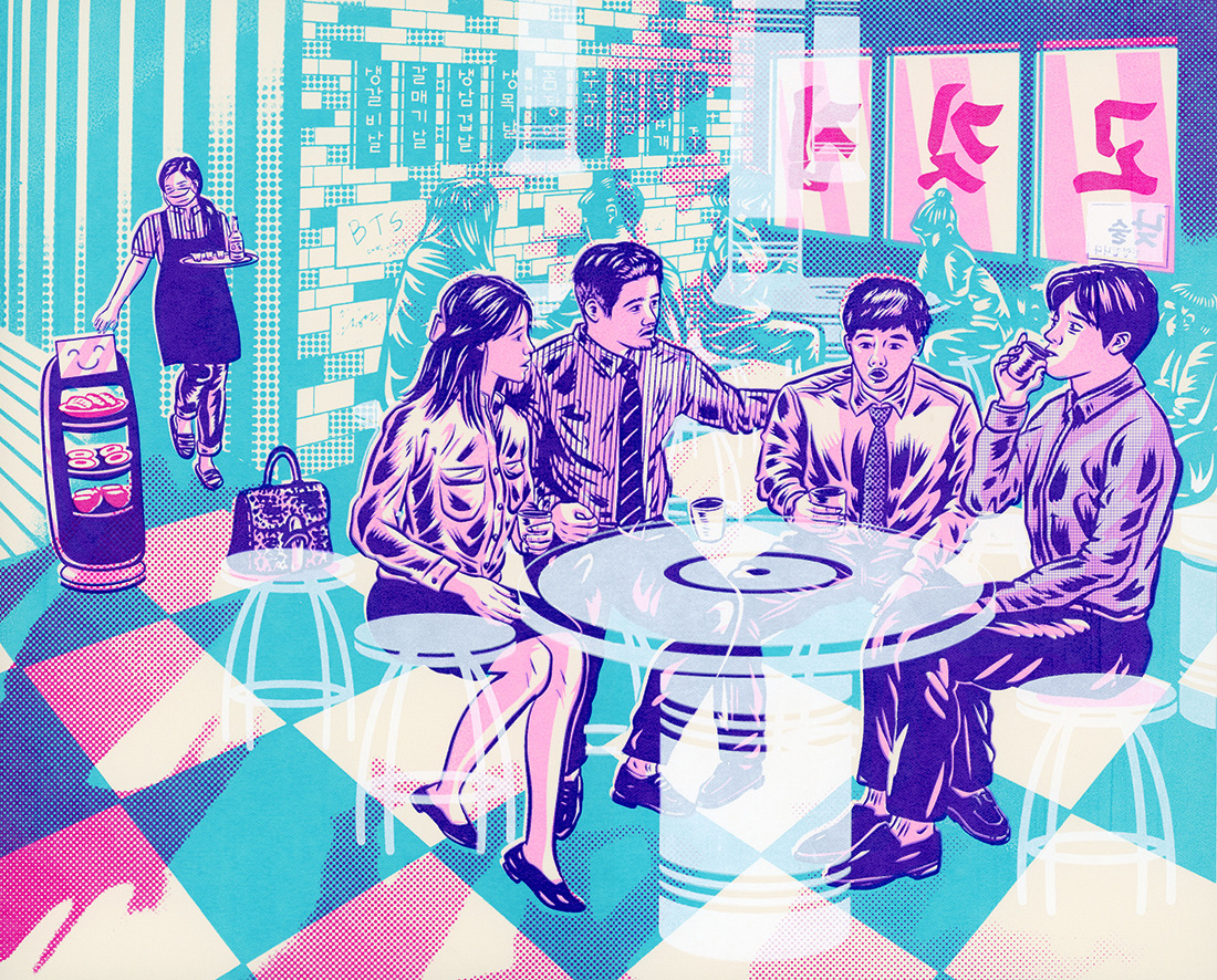 재해석 작품은 박종대 기자의 "4단계 길어지자 새 풍속도...'4명 낮술 모임'"이라는 수원뉴시스의 2021/8/9의 기사를 바탕으로 제작하였습니다. 그림에서는 코로나가 한창일 2021년 여름, 거리두기 4단계 방역조치로 낮시간에 네 명의 회사원들이 낮술을 하려 기다리는 모습입니다. 메뉴 아래의 연예인들의 싸인으로 보아 맛집으로 소문이나 대목을 잡던 고깃집으로 보입니다. 서빙은 아주 흐뭇한 표정의 로봇이 도와주고 있습니다.
