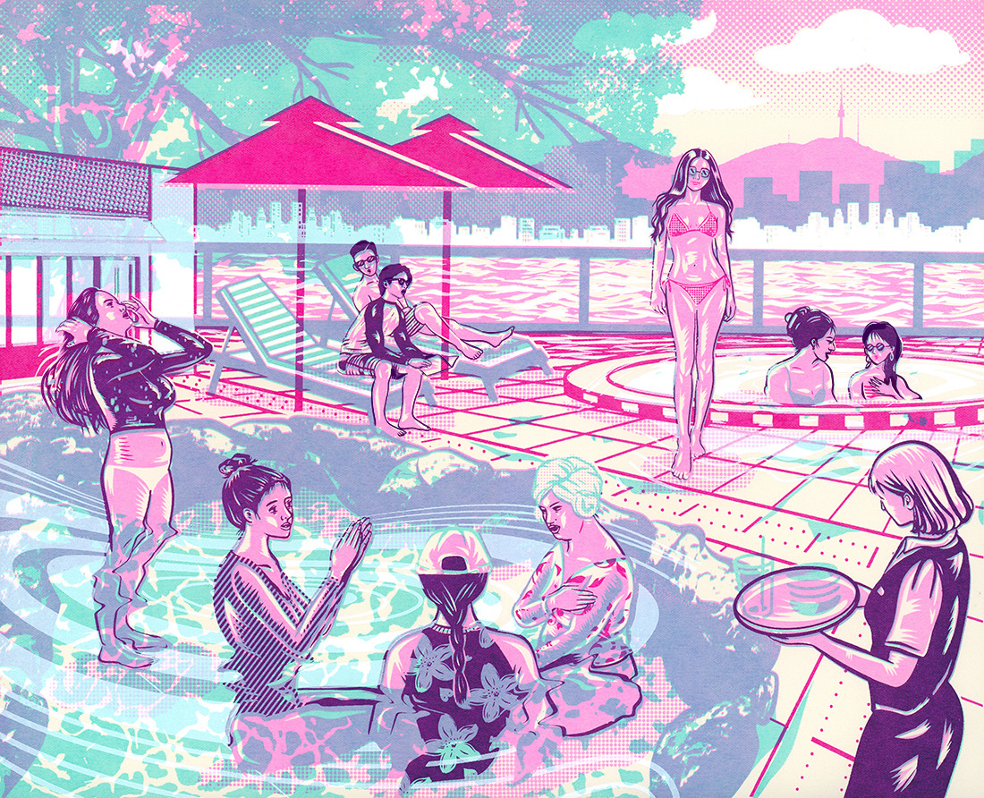 왼쪽에 보시는 작품은 초기에 구상했던 실내 목욕탕 씬입니다. 당시 코로나가 해제된 후 실내 목욕탕에서 여성들이 마스크를 벗고 자유롭게 사우나를 즐기는 풍경을 그려보았습니다. 그러나 원작과의 매치를 위해 완성하지 않은 채 실외 풍경으로 재구상하였습니다.