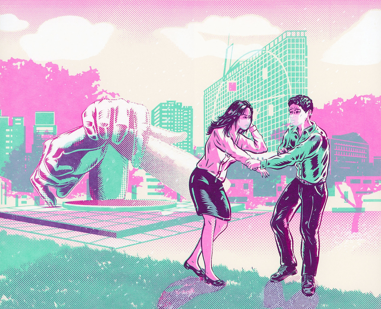 The reinterpretation of the artwork is set against the backdrop of the Gangnam Style sculpture in front of COEX in Gangnam. On a spring day where one must wear masks due to yellow dust and COVID-19, a man and a woman are seen lover's quarrel in front of the wrist statue dedicated to Psy's "Gangnam Style," a symbol of the Hallyu Wave that took center stage in 2016. Despite the appearance of a lovers' quarrel, the woman's expression seems to strongly convey a dislike, more evident than during the Joseon Dynasty era. The man's expression and posture appear helpless, and the resemblance between the woman's wrist being pulled and the statue behind suggests a poignant connection. While the Joseon Dynasty's spring appears warm and beautiful, but the modern spring is truly lamentable, as warm weather often requires wearing masks due to the severe yellow dust.