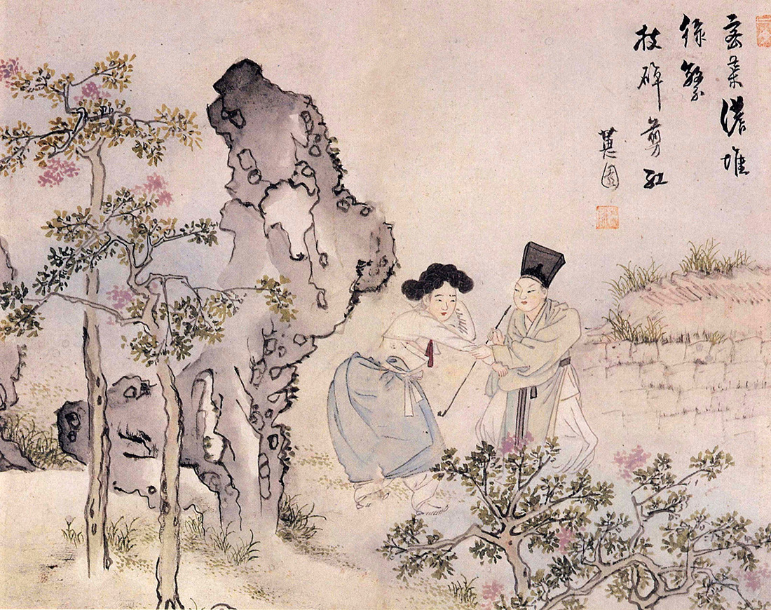화제의 “春色滿園中, 花開爛漫紅. “은 "봄빛 전원에 가득하니 붉은 꽃은 흐드러지게 피었구나"입니다. 여기서 붉은 꽃은 곳곳에 핀 백일홍 나무의 꽃일 수도, 마음에 핀 욕정의 꽃일 수도 있겠네요. 이 작품에서 두 사람보다 훨씬 덩치가 큰 괴석이 이러한 해석을 가능하게 해 줍니다. 마치 남근을 상징하는 듯한 이 괴이한 모양의 괴석은 꽤나 노골적인 은유를 보여줍니다.