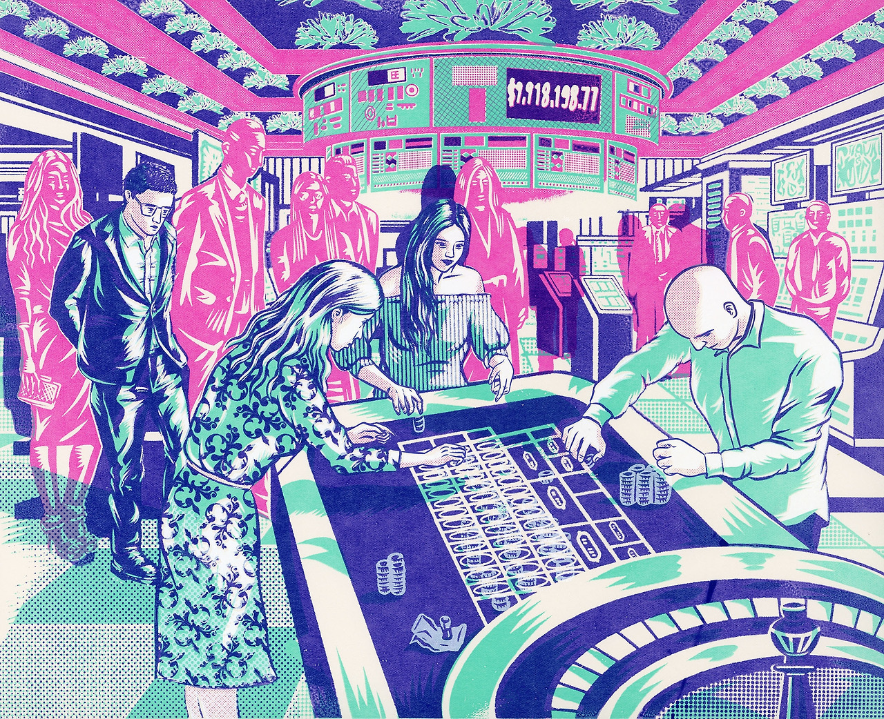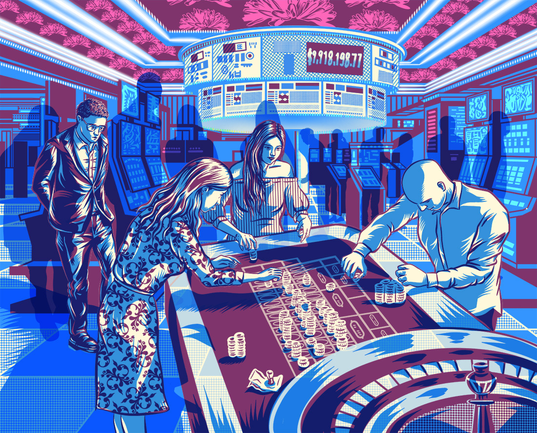 The painting is set against the backdrop of a casino. It depicts onlookers observing a man and two women deeply engrossed in a game at a tourist destination's casino. Particularly, the pose of the man on the left, leaning forward with a gesture of anticipation, to add a similar sense of amusement as in the original. Although not visible in the painting, could there possibly be someone in the background hitting the jackpot?