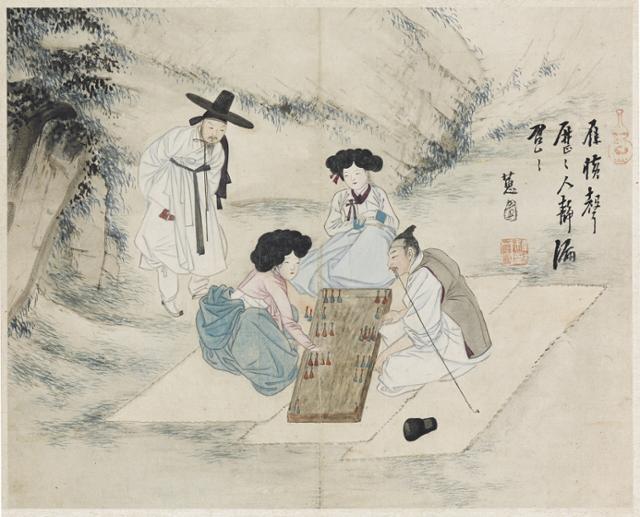 언덕 아래의 산자락에서 유생과 벼슬을 하지 않은 남자가 기생들을 데리고 나와 함께 쌍륙(雙六) 놀이를 즐기고 있는 모습입니다. 조선후기의 경제력 성장으로 여유를 갖게 되자 나라안에 도박과 게임중독이 성행하게 됩니다. 결국, 국가에서 나서서 제지할 정도로 심각한 사회문제가 되었다고 하는데요... 쌍륙은 서양의 체스와 견주어지는 두 편으로 팀을 나누어 주사위를 던져 말을 옮겨가며 하는 보드게임이라 할 수 있습니다. 당시 투전이나 골패는 남성들의 투기성을 띤 방탕한 노름이라 한다면 쌍륙은 그에 비한다면 도박성이 약한 부녀자들의 게임으로 볼 수도 있겠습니다... 그러나 이 기사를 참조해 보면 그 심각성이 가볍지만은 않은 듯합니다. 쌍륙삼매경에 빠져 공주가 병이나도 뒷전이었고 심지어 이 놀이를 하다 싸움으로 번져 궁에 불을 낸 자도 있었다고 하네요... 신윤복 그림의 등장인물들이 왜 이리 열중했는지 알 수 있는 일화들이라 흥미롭습니다.