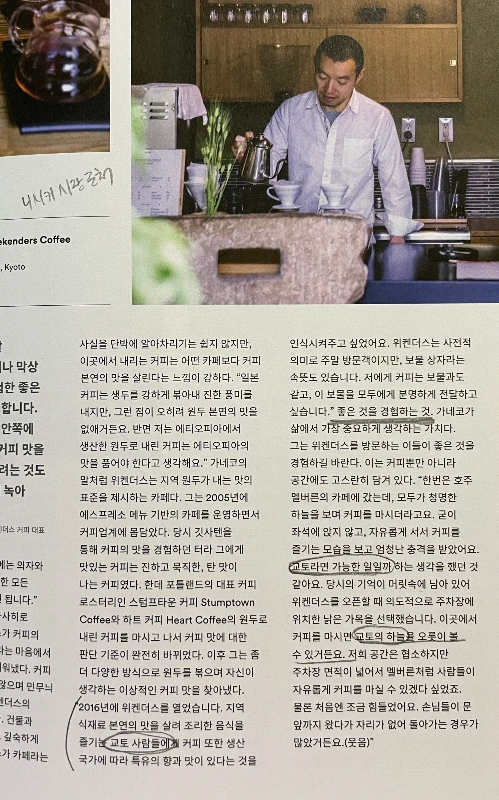 위켄더스를 알게 된 건 매거진 B 교토 편에서였다. 권위자의 추천을 믿는 편이라 안목 좋은 매거진 B가 추천하는 카페들 중 한 곳을 가고 싶었다. 매거진 B 교토 편은 여러 카페들을 소개했는데 그중에서도 위켄더스를 선택한 이유는 대표 가네코 마사히로의 인터뷰 때문이었다. 그가 위켄더스를 열면서 교토 사람들에게 주고 싶었던 커피 경험, 카페 공간으로 주차장 안의 낡은 가옥을 선택한 이유 등에서 이 카페에 가면 맛있는 커피를 마시는 동시에 '교토라서 가능한'경험을 할 수 있을 거란 기대감이 들었다. 첫 번째 교토여행이니 만큼 교토스러운 곳들을 가고 싶었는데 나의 필요와 딱 맞는 곳 같았다. 그렇게 위켄더스는 내 구글맵에서 별을 달았다. 꼭 가야 하는 곳이니까.