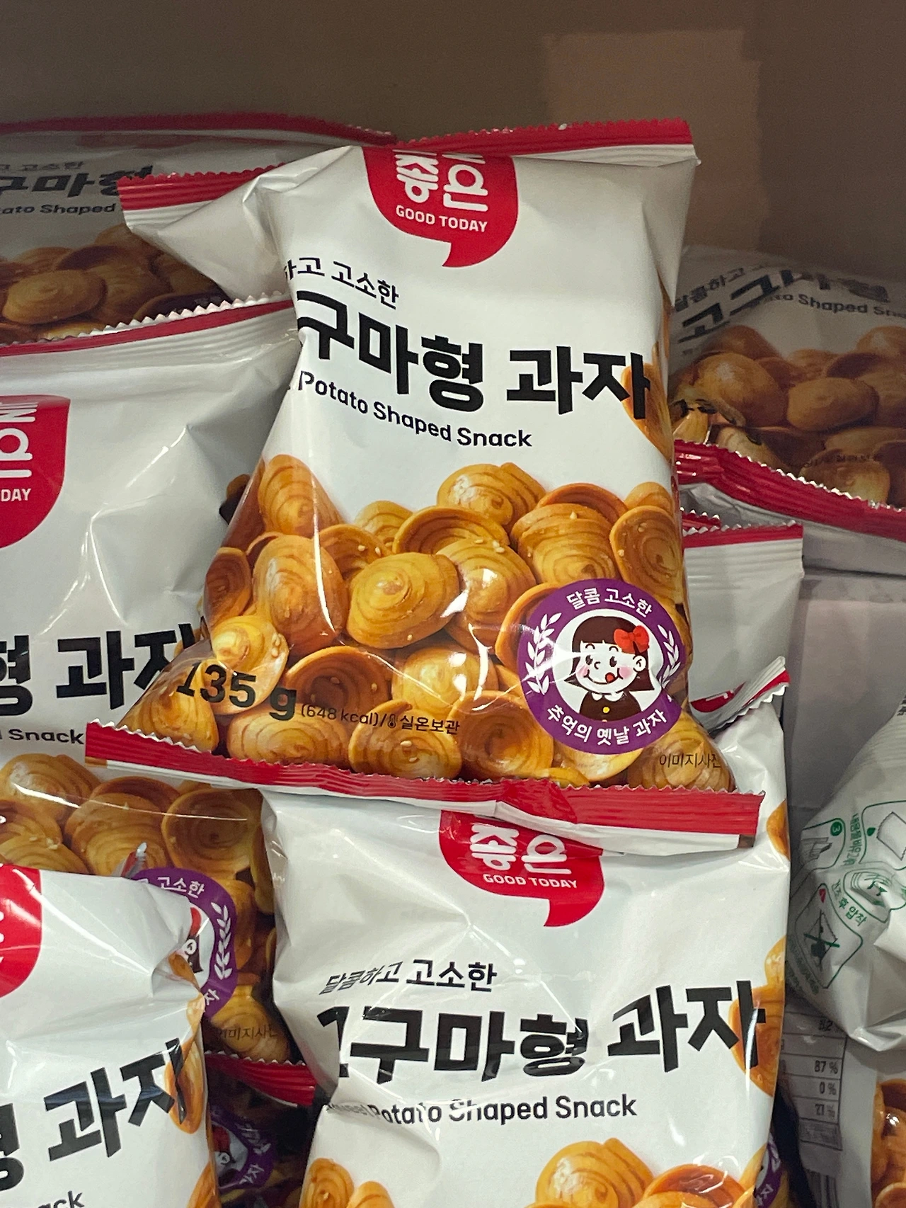 구황작물계 과자군에서 내 선택은 늘 감자였다. 감자깡, 포테토칩, 오감자!, 구운 감자 등이 진열된 가판대에서 뭘 고를까 행복한 고민을 했다. 고구마, 옥수수 과자는 관심 없었다. 특히 고구마 과자는 정말 취향이 아니었다. 당시 내가 경험한 고구마과자는 두 개였다. 할아버지 댁에 가면 볼 수 있는 고구마형 과자와 언니가 고르곤 했던 고구마깡. 둘다 너무 달고 끈적했다. 고구마 향이 나긴 했지만 고구마에 비할 게 아니었다. '고구마과자보다 고구마가 맛있는데 굳이?' 중1때까지 고구마 과자는 안중에 없었다.