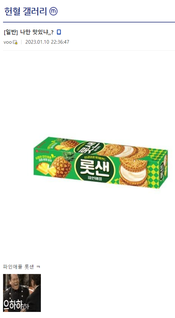 헌혈 후 먹는 롯샌의 맛은…끝내줬다. 단단한 쿠키와 그 사이로 적당히 샌딩되어 있는 달콤 상큼한 파인애플 크림의 조합이 맛으로나 식감으로나 훌륭했다. 씹을 땐 단단한 쿠키가 입안에 들어가자 부드럽게 녹았다. 파인애플 크림은 쿠키와 잘 어우러졌다. 자주 먹는 과일이 아니라서 그런지 파인애플의 이국적인 맛과 향이 더 독특하게 느껴졌다. 파인애플향이 이렇게 상큼했던가. 풍부했던가. 모양도 맛도 화려한 과일, 파인애플의 위력을 체감했다. 파인애플은 아주 적은 양으로도 존재감을 남기는 과일이라는 걸 이 날 처음 느꼈다. 고작 0.19%로 과자의 정체성이 될 수 있다니. 성분비에서 가장 높은 자리를 차지하고 있는 건 밀가루일텐데. 앉은 자리에서 하나, 두개, 세개를 먹다가 결국 한 봉지를 다 먹었다. 강렬한 첫 만남이었다. 다른 과자들도 있었지만 롯샌 한 봉지면 충분했다. 롯샌 효과 덕분인지 빈혈없이 씩씩한 걸음으로 무사히 귀가할 수 있었다.