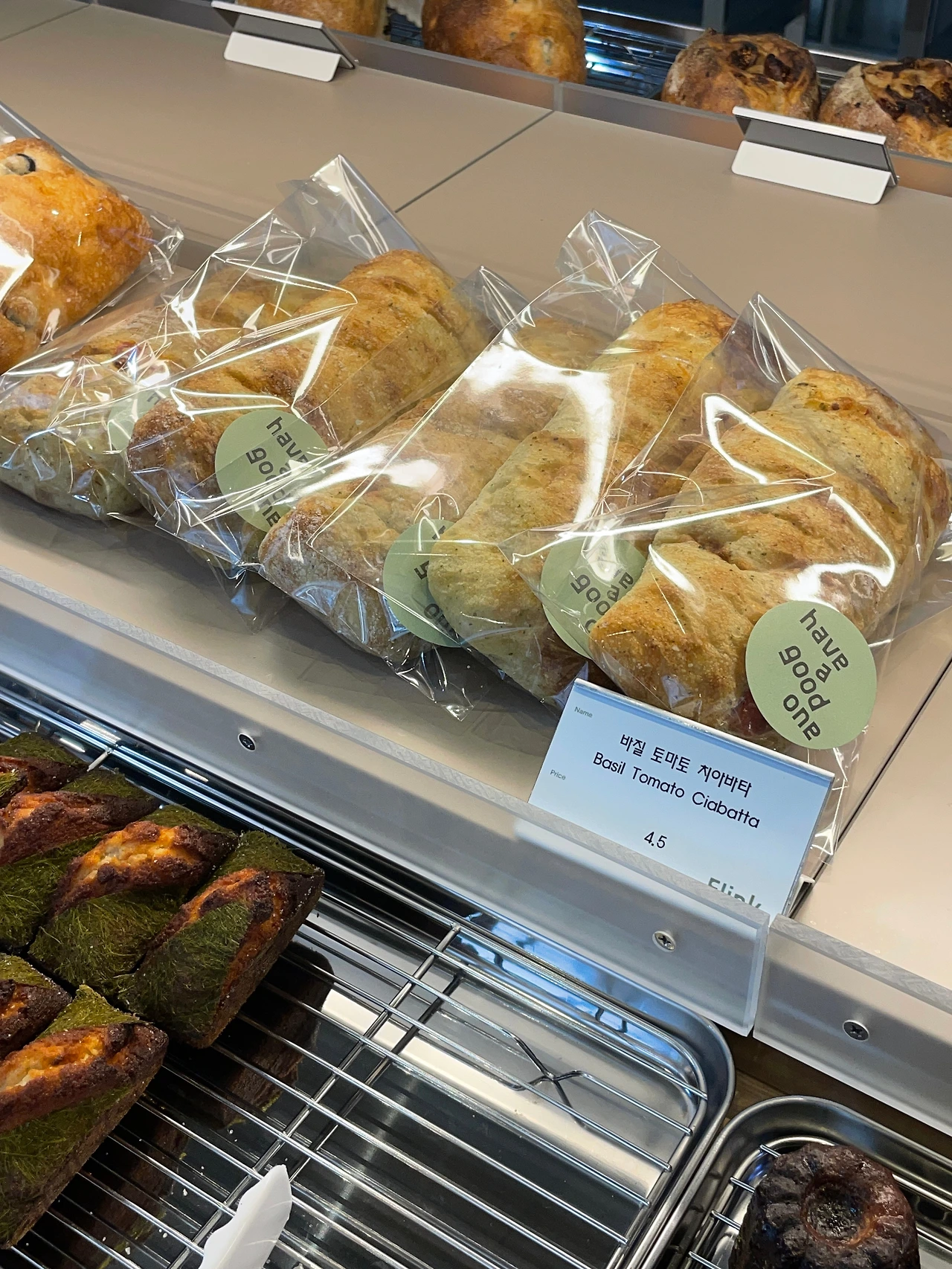오늘 아침 여기서 맛본 건 바질 토마토 치아바타였다. 웬걸? 이렇게 쫄깃한 치아바타는 처음이었다. 이 정도면 빵이 아니라 떡에 가까운 거 아닌가 싶을 정도로 쫄깃한 치아바타였다. 맛도 깔끔했다. 아낌없이 재료를 들이부은 푸짐한 맛집이 있는가 하면 재료들을 쓱 섞어 간결한 맛을 내는 맛집도 있다. 플링크는 후자였다. 토마토도 바질도 딱 적당량이 들어간 것 같고, 맛의 조화도 훌륭했다. 어떤 치아바타는 너무 깔끔해서 심심하거나, 지나치게 오일리한 경우도 있는데 여긴 아니었다. 모자라지도 과하지도 않았다. 이 공간의 깔끔한 무드와 어울리는 간결한 맛. 맛과 공간의 무드가 일치할 때 느껴지는 깔끔한 인상, 세련된 일치감에 편안했다.