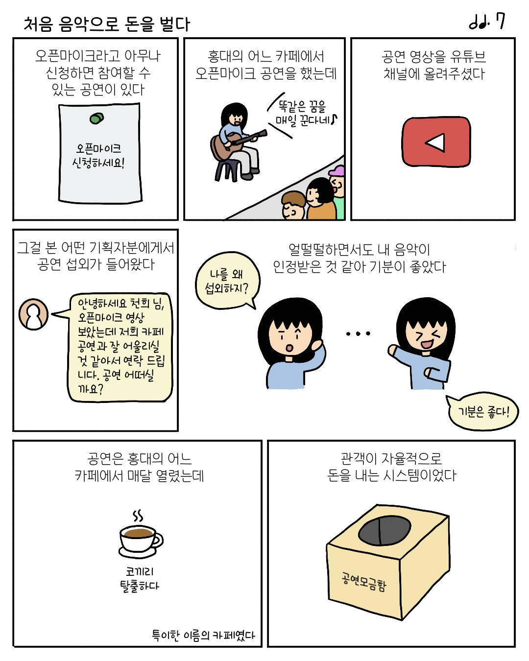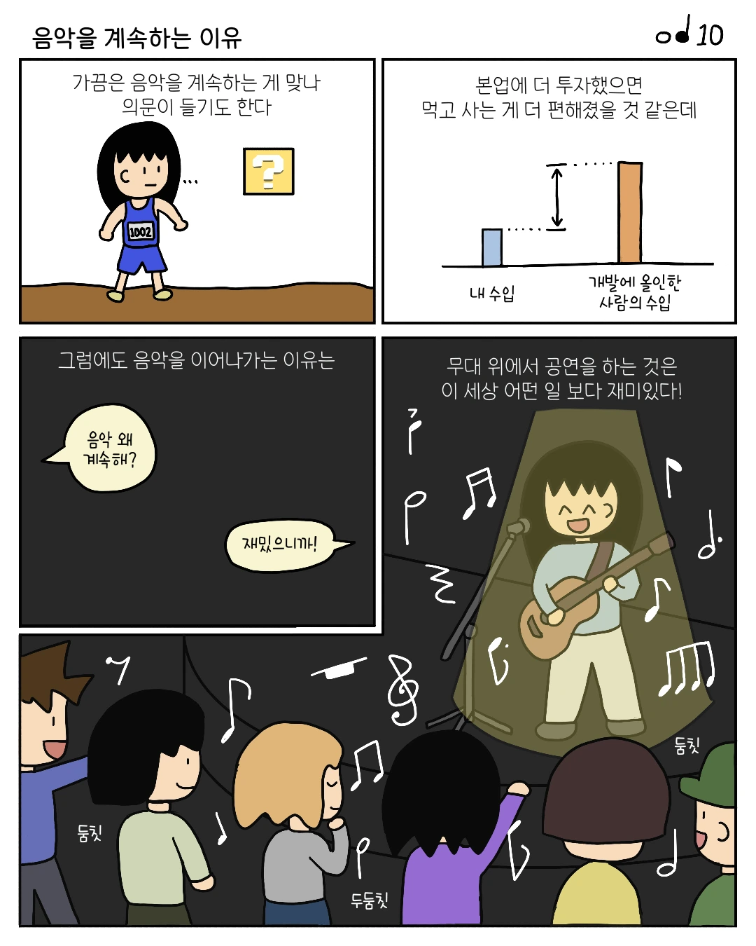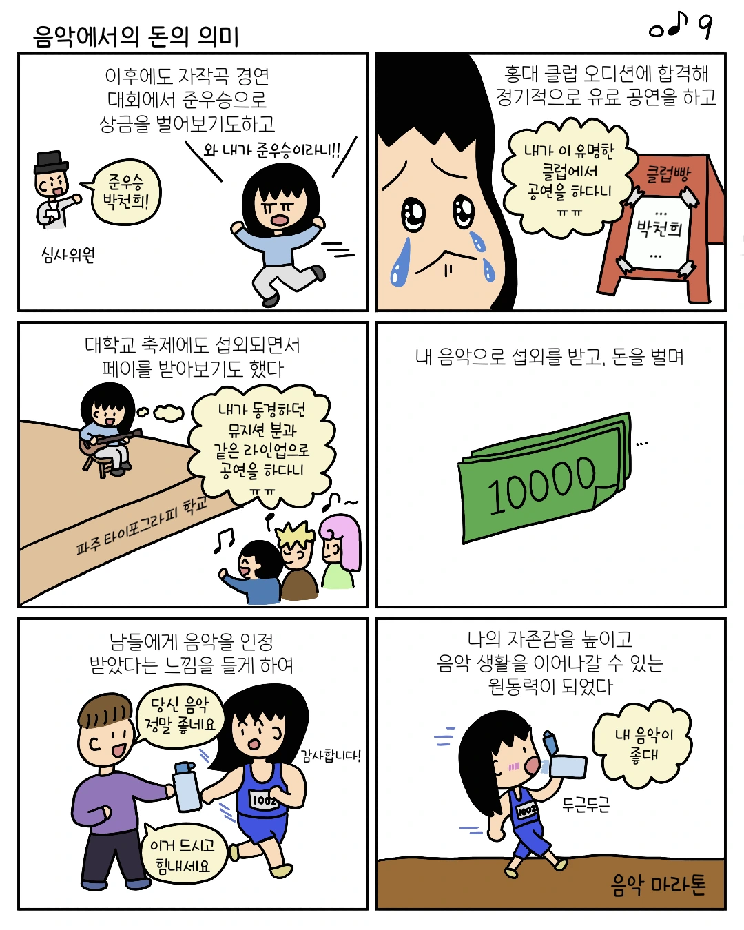 음악을 하며 생겼던 수입은 단순한 돈이 아니라 제가 음악을 계속 해나갈 수 있는 원동력이 되었습니다. 제 음악을 칭찬해주셨던 말들은 아직도 생생히 기억에 남아 제게 힘이 되고 있어요.
