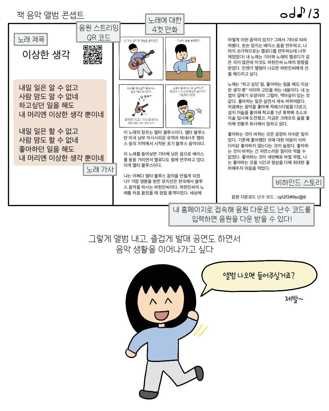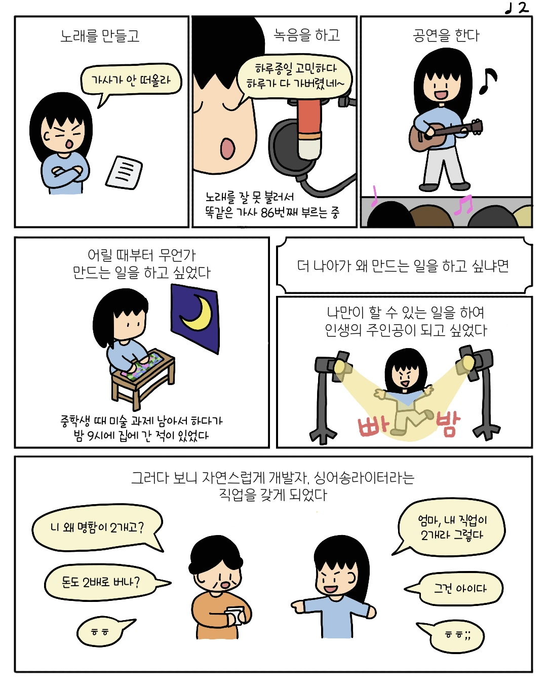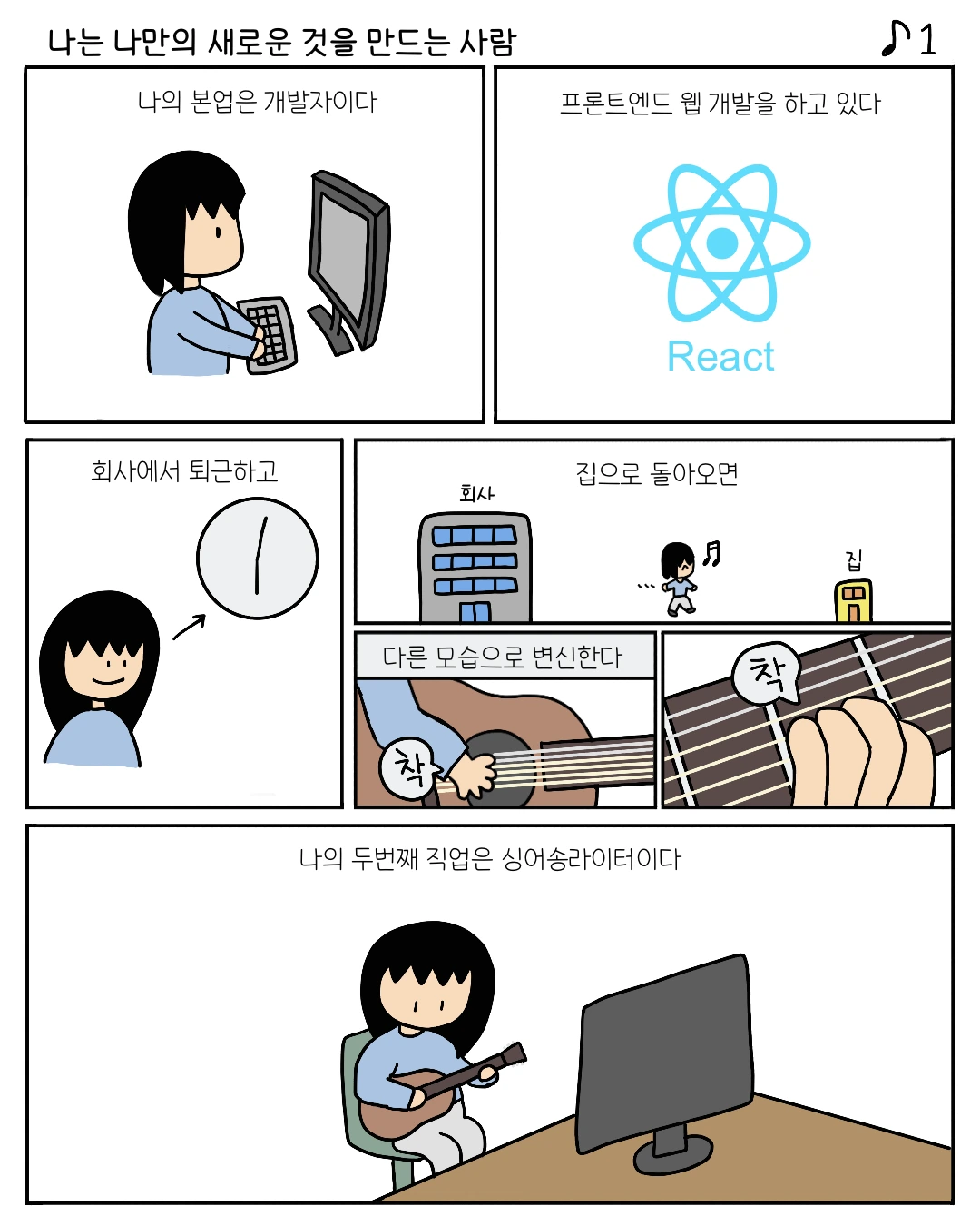 제가 좋아하는 것 중 하나가 음악입니다. 음악을 좋아하다 보니 자연스럽게 노래도 만들게 되었어요. 지금은 델타블루스와 포크 장르의 1집 앨범을 준비하고 있습니당.