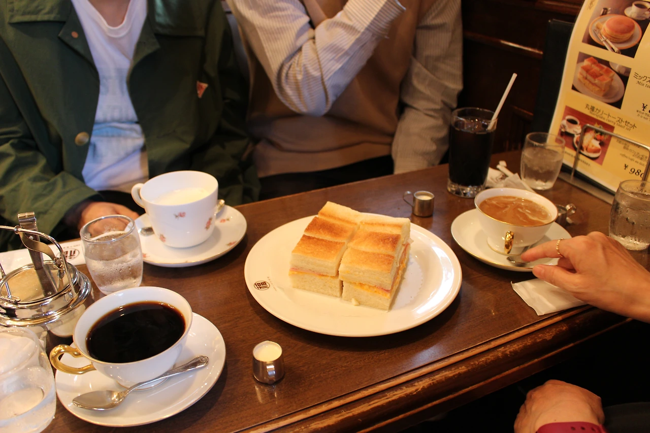 카레 우동을 11:30에 먹기로 했지만 부모님의 아침 식사를 굶게 해 드릴 순 없는 법, 우리 가족은 호텔 조식을 신청하지 않았기 때문에 호텔 근처의 "마루후꾸 커피점"이라는 곳에 가서 커피와 빵을 먹기로 했다. 마루후꾸 커피점은 1934년에 문을 열었다고 한다. 무려 85년이나 된 오래된 카페다.
