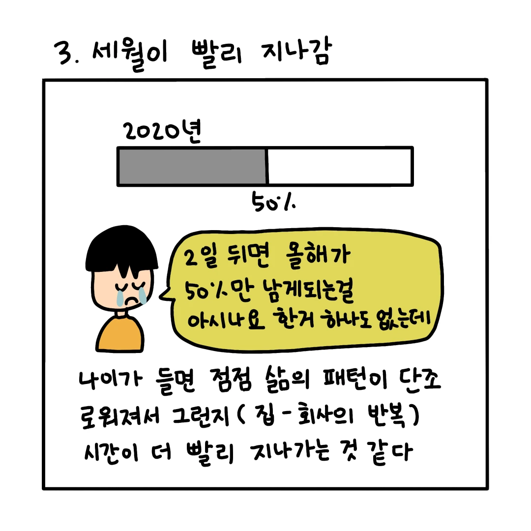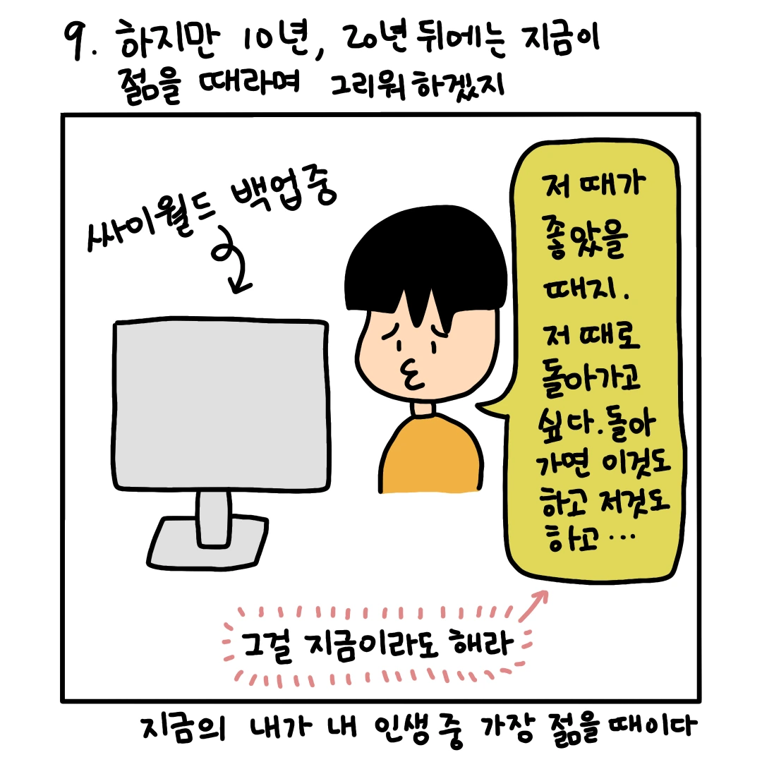 제가 나이가 많진 않지만 어릴 때와는 달라진 저를 가끔 발견하게 됩니다. 사람이 변하는건 어쩔 수 없는 일입니다. 하지만 내가 어떻게 살아가느냐에 따라 내 모습도 달라질 거에요. 더 늙기 전에 하고 싶은 일들을 하나씩 해내가면서 살아가고 싶어요!